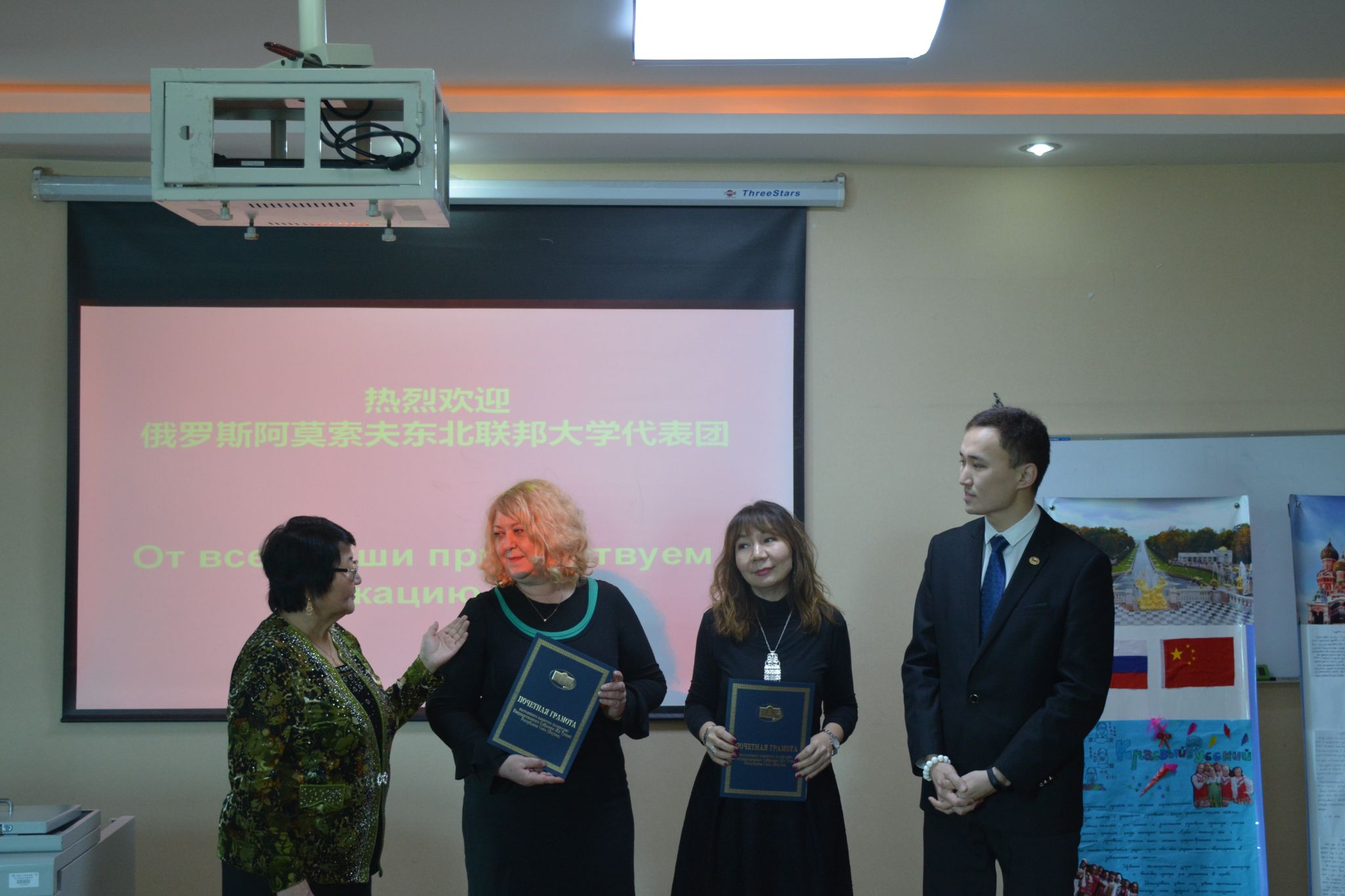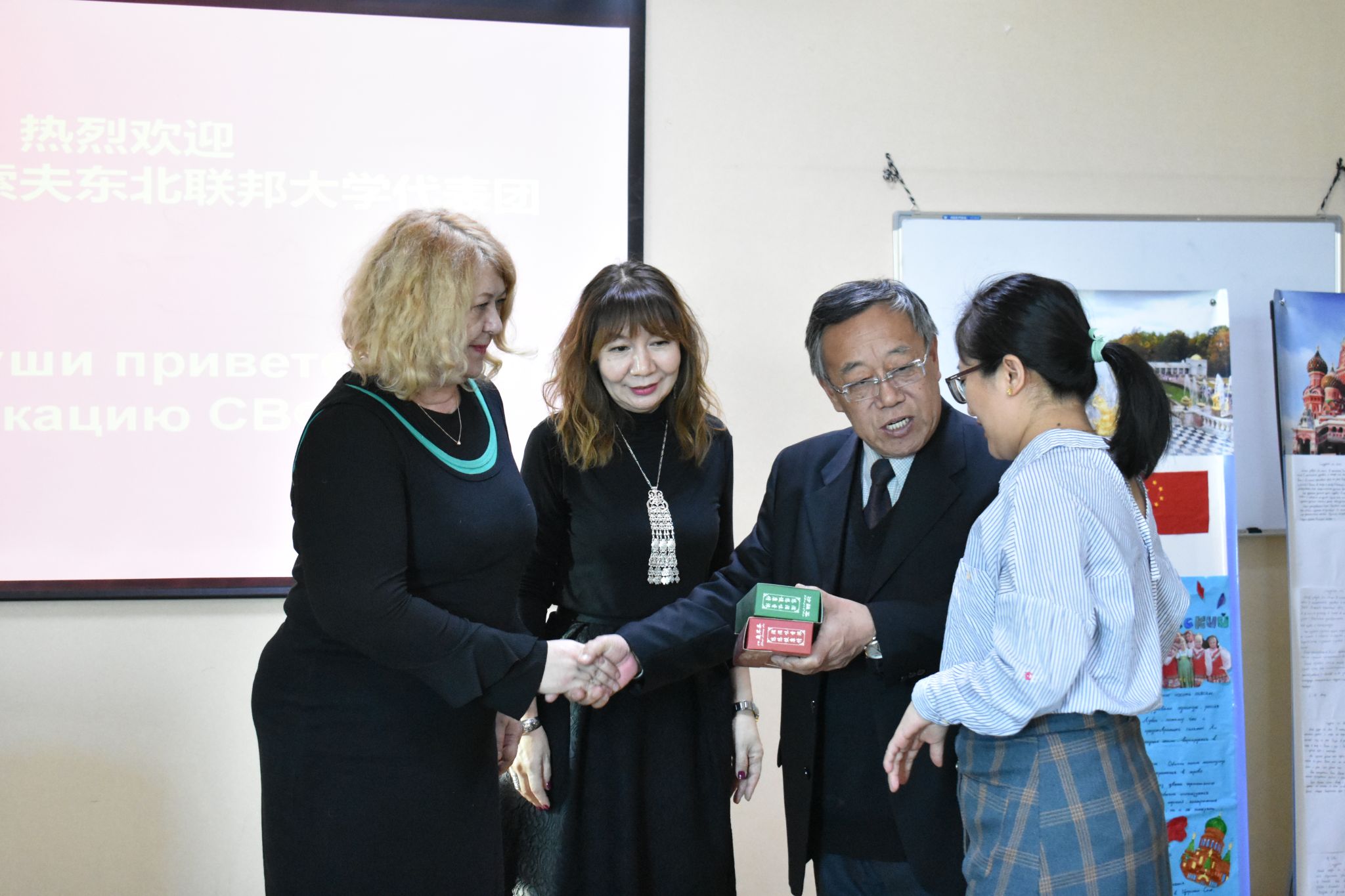 12月12日俄罗斯阿莫索夫东北联邦大学学术带头人、教学科研博士、教授、彼得罗夫科学艺术研究院院士、亚太俄语及俄罗斯文学协会主席团成员彼得洛娃为我校外国语学院四名俄语教师进行了教学法的专题讲座,文学系副教授欧申普科娃进行了俄语文学方向的专题讲座。语言系系主任荣德罗娃为我校俄语学习者主持了俄语竞赛。三位专家学者为我校师生在俄语学习中遇到的困难和问题答疑解惑。