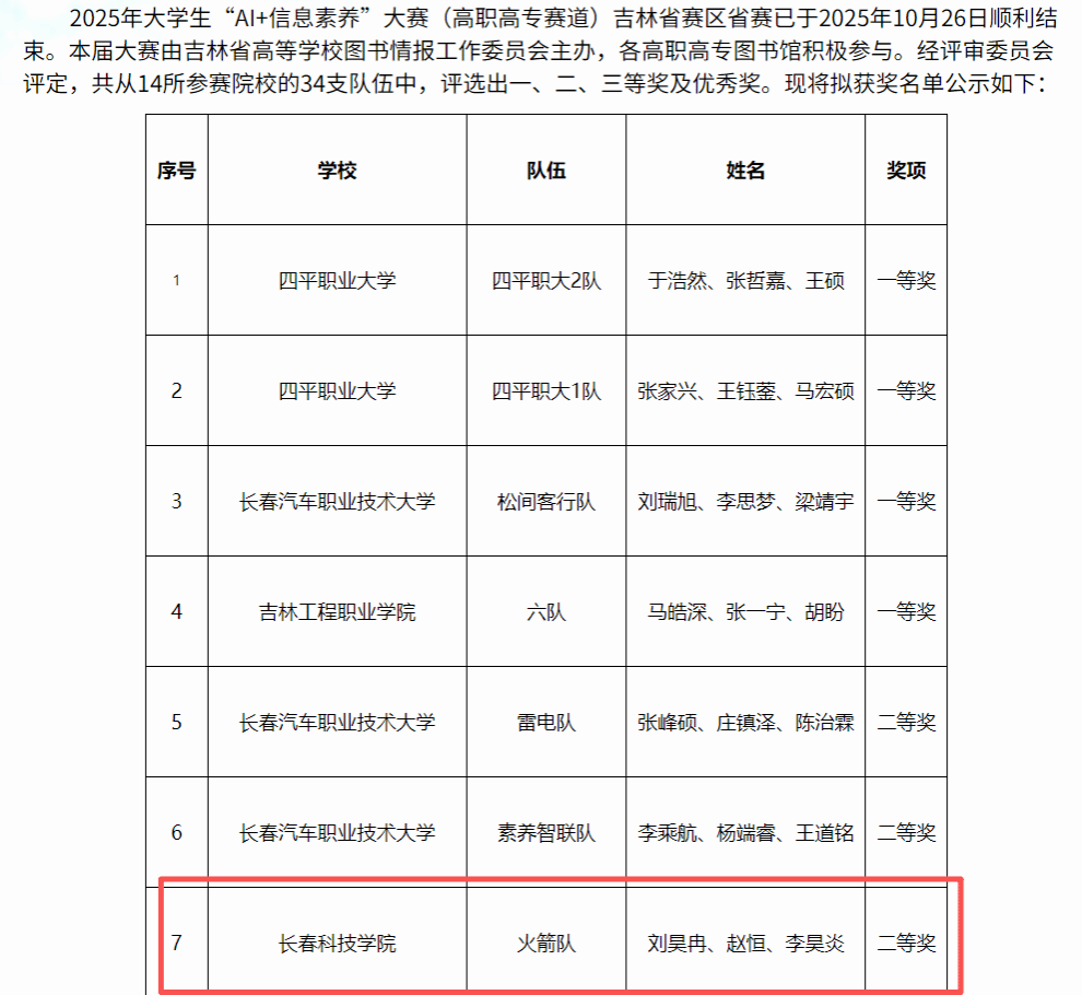 10月28日,2025年吉林省大学生“AI+信息素养”大赛(高职高专赛道)省赛决赛成绩揭晓。由职业技术学院刘燚老师指导,24级医学影像技术赵恒、24级数字媒体技术刘昊冉和23级计算机应用技术李昊炎三名同学组成的参赛团队,凭借出色的表现,在全省众多优秀队伍中脱颖而出,荣获省级二等奖的优异成绩!
