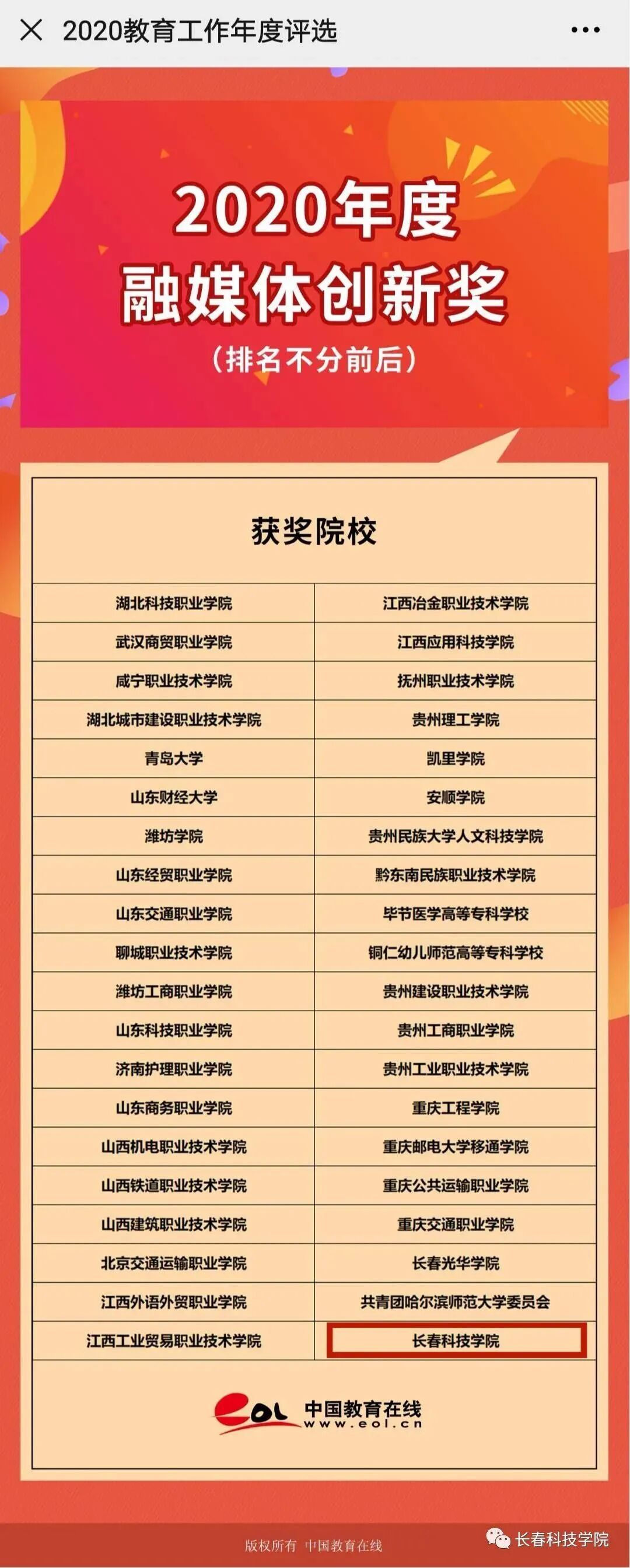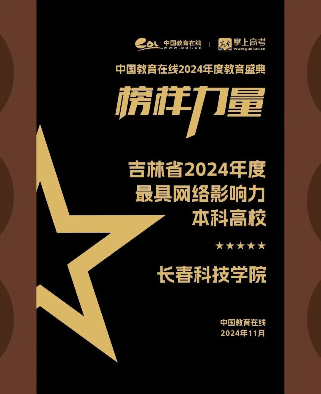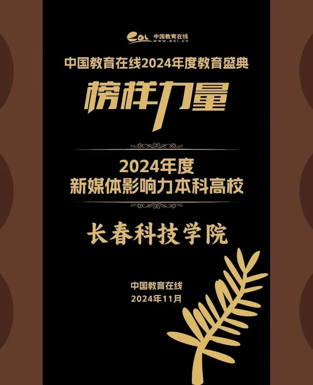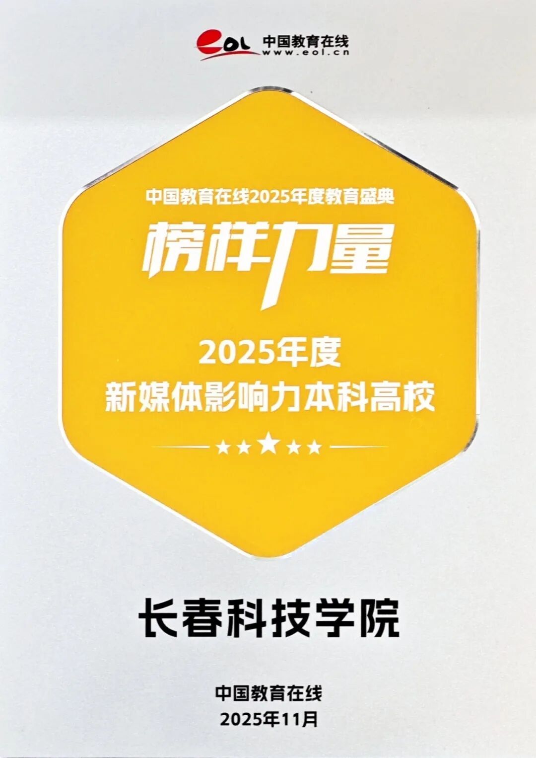 近日,中国教育在线“榜样力量·2025年度教育盛典”榜单正式发布,长春科技学院凭借在新媒体领域的卓越表现与广泛影响力,再度获评“2025年度新媒体影响力本科高校”。