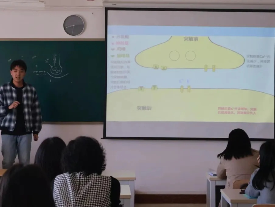 新入职教师刁自鹏老师对《药理学》进行公开讲解,并要求院长尤丽新、教授刘春杰、教授秦风贤、教授陈巍、教授于妍、教授郑义、教授刘蓓等对其进行点评,大家一致认为刁自鹏教态好,语言流畅,语速语调适宜,以动画形式及临床案例展示吗啡作用机理,通俗易懂,若能深挖作用机理并配合思政案例加以扩展会锦上添花,未来可期!