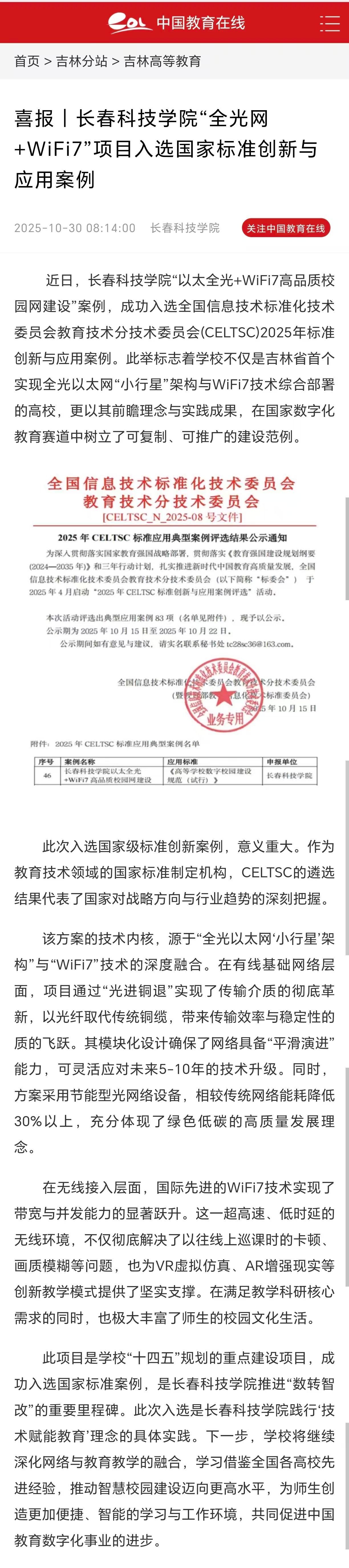 喜报|长春科技学院“全光网+WiFi7”项目入选国家标准创新与应用案例