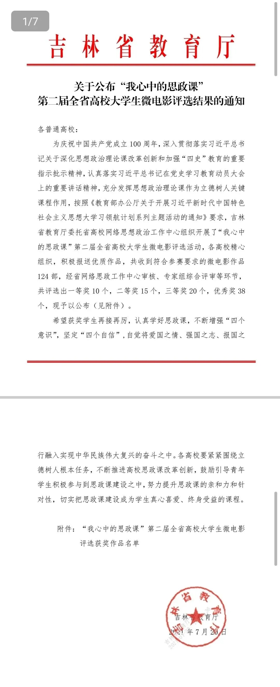 近日,“我心中的思政课”第二届吉林省高校大学生微电影评选活动结果揭晓。长春科技学院报送微电影作品《理想》获得三等奖。
