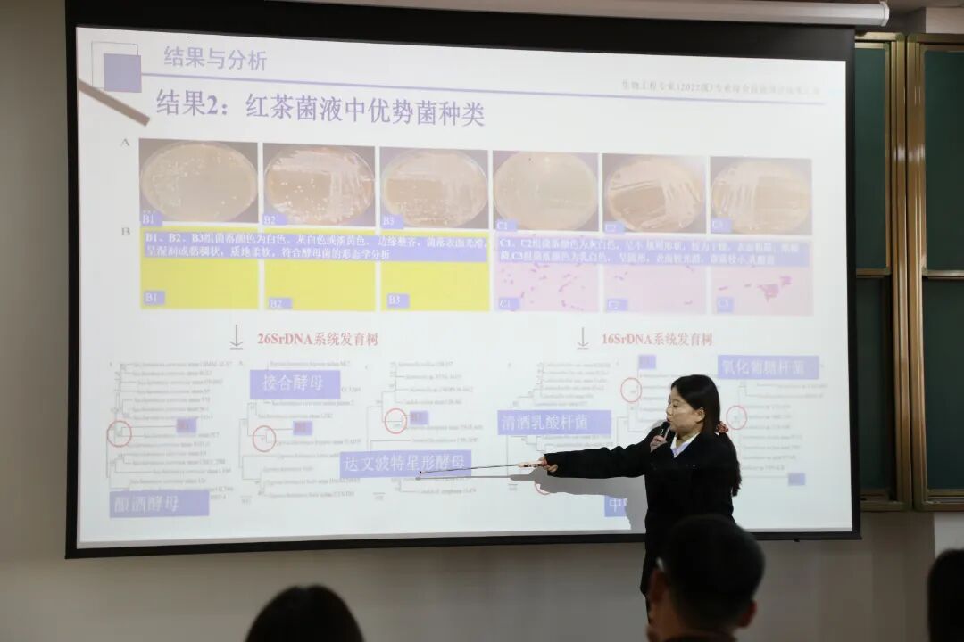 公开课的实践考核环节同样亮点纷呈——22级全体生物工程专业学生随即展开团队项目答辩。各团队围绕“生物膜的开发”“大豆遗传育种”“天然产物开发”“生物制药”等自主研发的项目,从方案设计、实验实施、数据论证到成果转化前景进行全流程汇报。答辩现场组建了由特研生物研发经理冷森林、校教学督导贾冬舒、生命科学学院副院长尤丽新、生物工程专业主任刘艳,及专业核心教师组成的四方指导评审团,从不同维度为学生项目“把脉问诊”。面对评审团的连环提问,学生们沉着应答,结合前期实验积累展开论证。充分展示项目式教学提高学生自主能动性,创新性及对知识的应用能力。