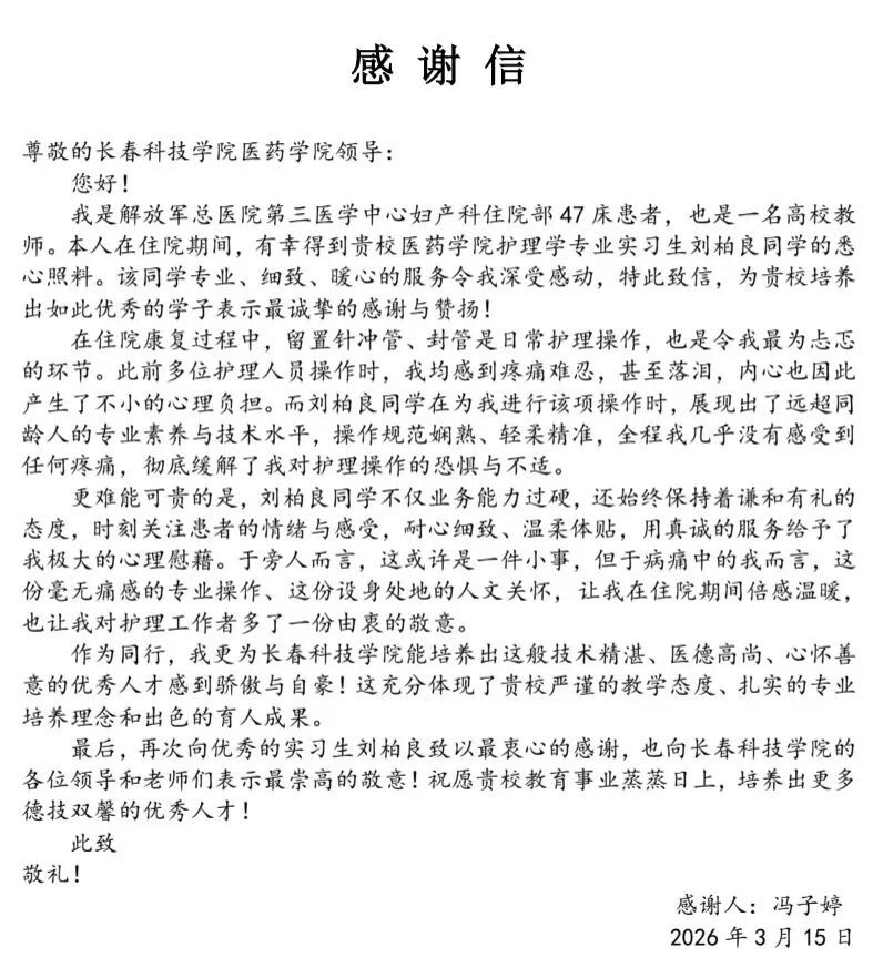 这封患者感谢信不仅是对刘柏良同学个人专业能力与职业素养的肯定,更是对学院护理学专业人才培养质量的有力见证。一直以来,长春科技学院医药学院坚持以临床需求为导向,深耕护理人才培养,注重学生专业技能与人文关怀的同步提升,鼓励学生在临床实践中践行“以患者为中心”的服务理念。