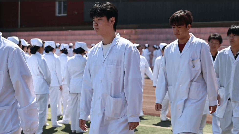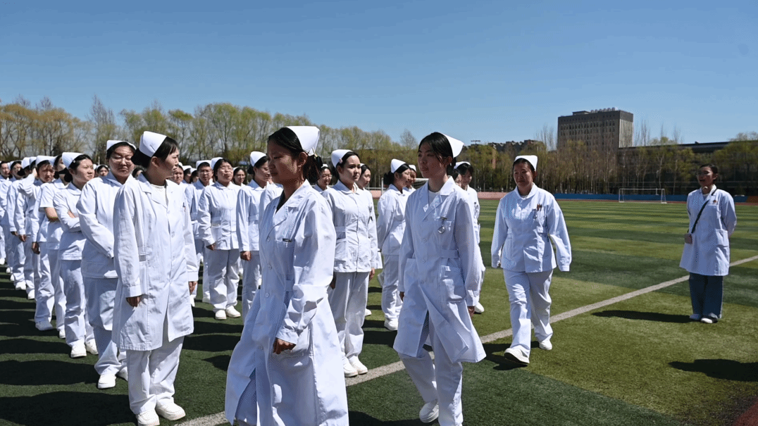 操场上,学生们身着整洁的护士服,头戴护士帽,精神抖擞、列队整齐,依次进行礼仪展示。站姿考核时,同学们身姿挺拔、神情庄重;蹲姿环节,大家动作轻柔、姿态优雅;走姿考核中,队列步伐整齐划一、步履稳健,展现出护理人员特有的专业与干练。考核教师全程严格把关,细致观察每一个动作,对姿态不标准、动作不规范之处逐一现场纠正,确保学生精准掌握礼仪规范。