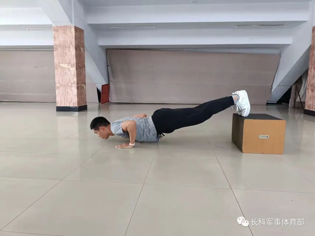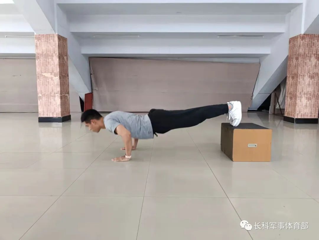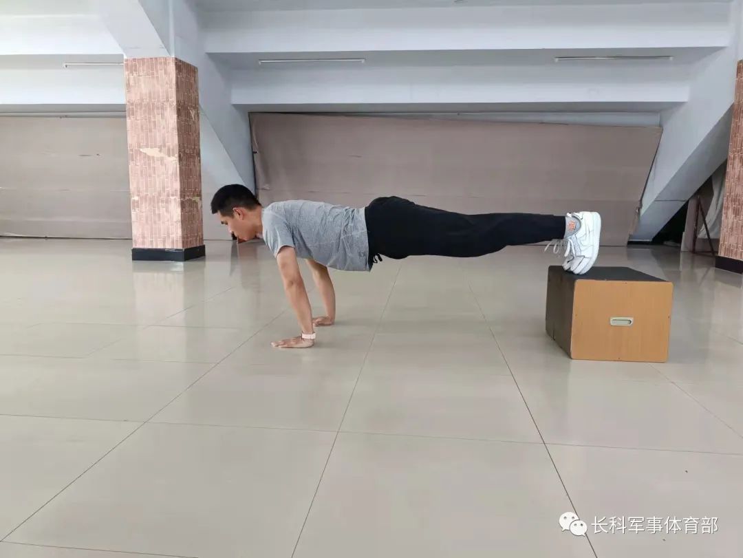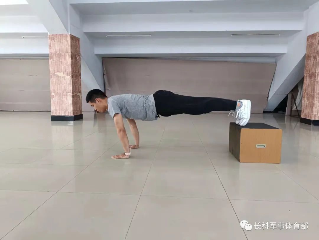 下斜俯卧撑:面朝下双手撑于地面上,间距略宽于肩,双脚放在凳子上以脚尖接触凳面。身体挺直保持一条直线,收紧腹部。吸气下落,呼气撑起,慢落快起,起落过程中均需保持身体挺直。下落至胸部贴近地面即可,此时胸下沿应与掌跟处在同一水平线。