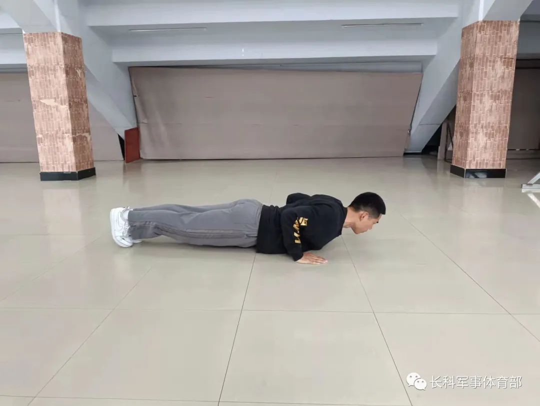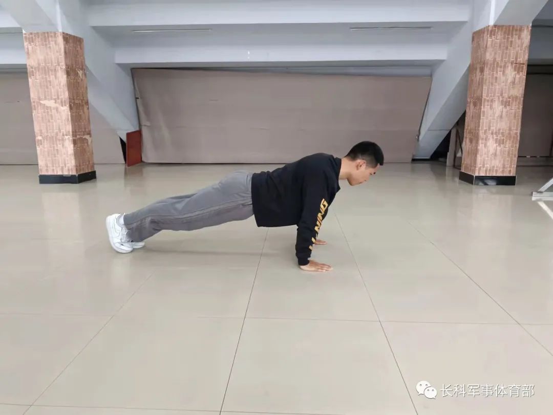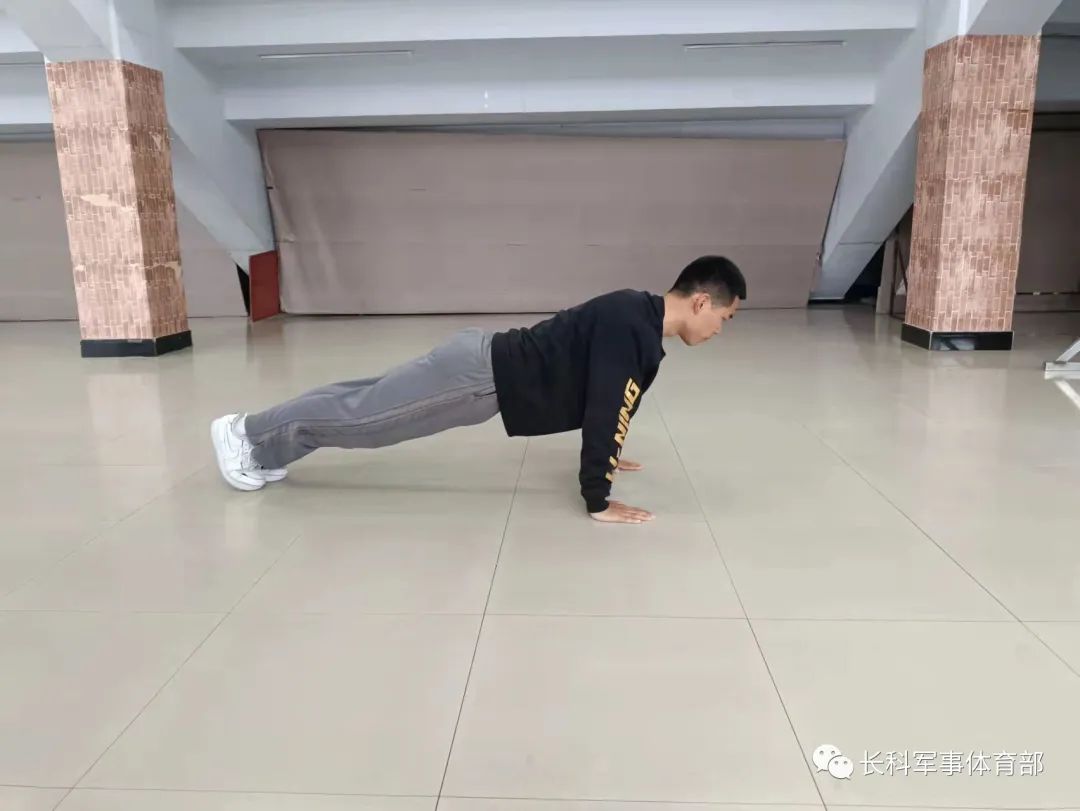 基础俯卧撑:俯身支撑于地面,双脚并起。身体从肩膀到脚踝保持成一条直线,双臂应该放在胸部两侧,使掌根与胸下沿齐平,两手间距略宽于肩膀。吸气下落,呼气撑起,下落与撑起过程中注意身体均要保持直线。