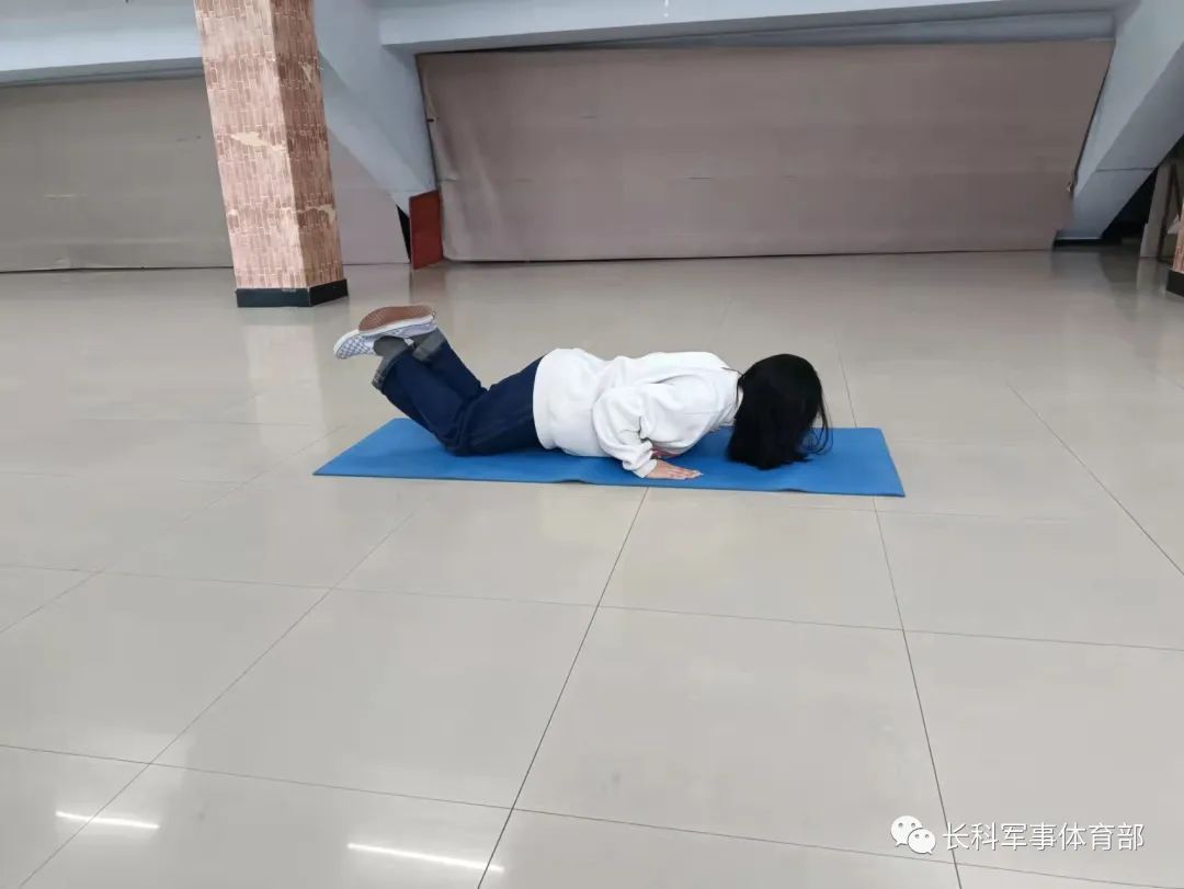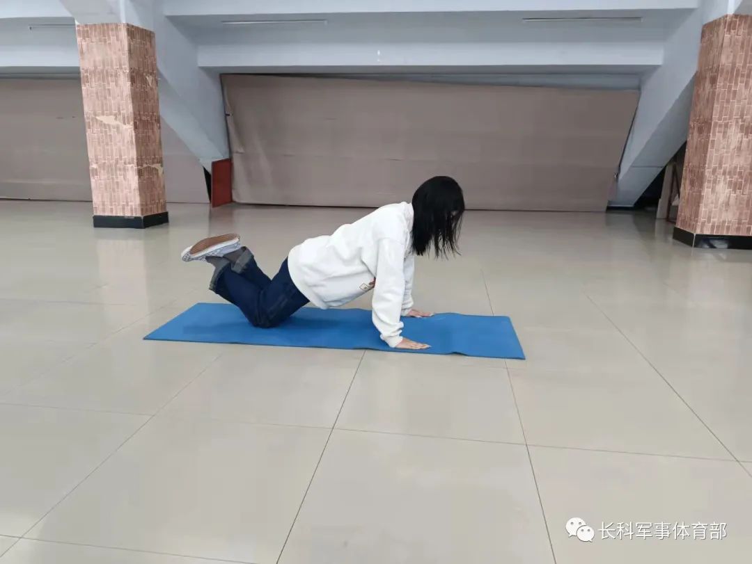 跪姿俯卧撑:双脚交叉,跪于垫上,腰背挺直,双手撑于胸部两侧,使掌根与胸下沿齐平,双手间距比肩略宽。吸气下落,呼气撑起,下落与撑起过程中注意腰背板直。