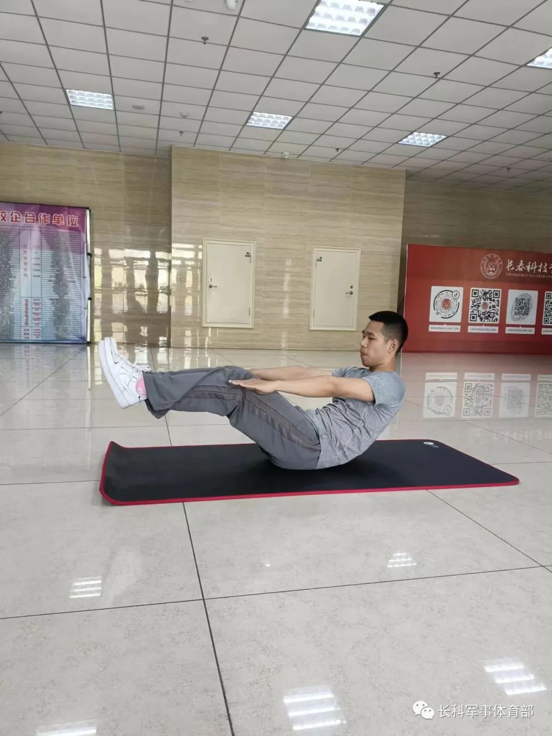 变异式V字支撑:身体自然站直在瑜伽垫前,然后躺在瑜伽垫上,双腿并在一起,双手自然放在身体两侧。小腿抬起与地面平行,大腿与地面形成约45度夹角,腹直肌收缩使上半身卷起,伸直双臂使之与小腿呈一条线上。此时大腿与上半身呈V字形状,双眼目视前方,使身体保持该形态并坚持一定的时长。