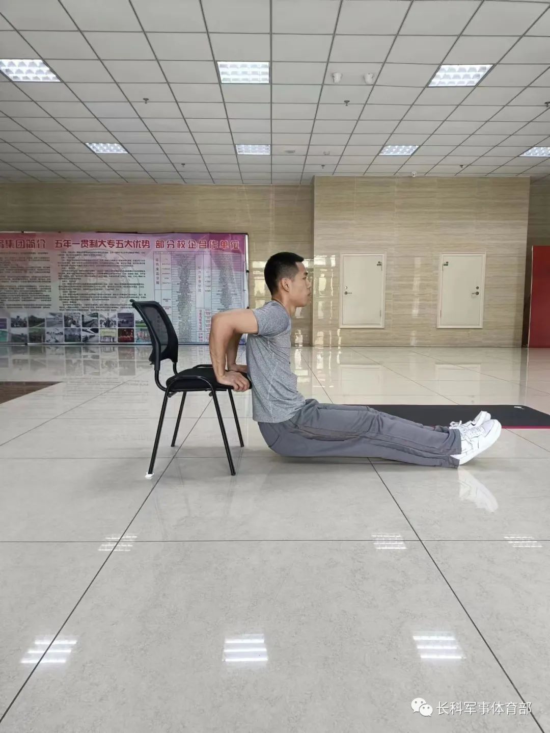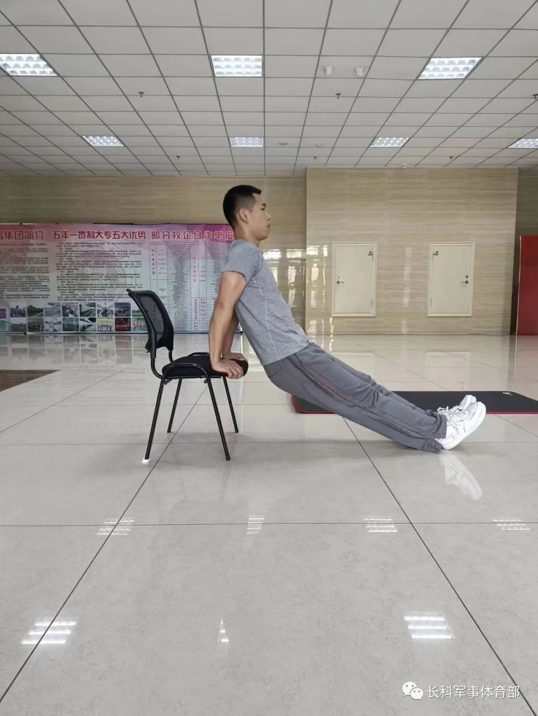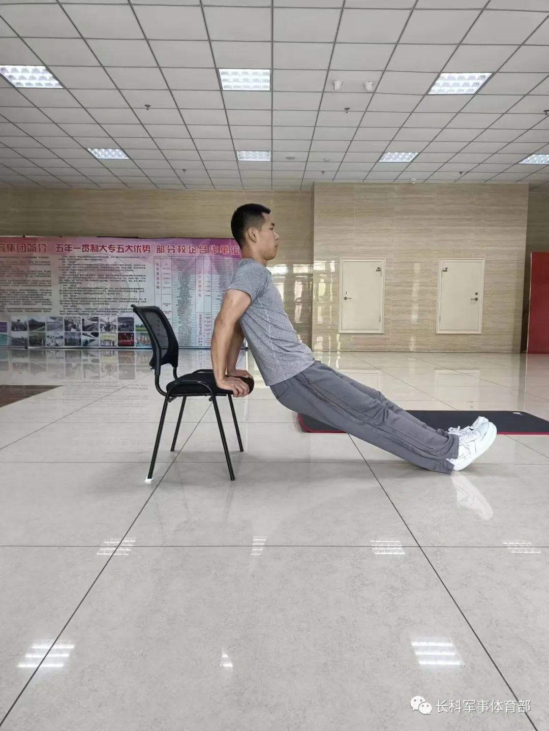 支撑臂屈伸:找一个椅子或者凳子,然后坐在椅子边缘处,注意要坐姿端正。双手按在臀部两侧,手臂伸直,接着双脚前伸使臀部离开椅子,此时双腿伸直并起且脚后跟着地,靠双臂支撑身体。控制身体缓慢下落,当大臂与小臂呈90度夹角时即停止下落,依靠肱三头肌收缩发力使手臂伸直身体撑起。
