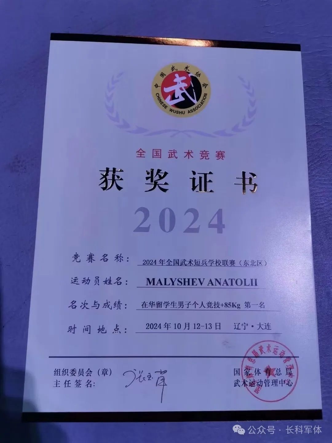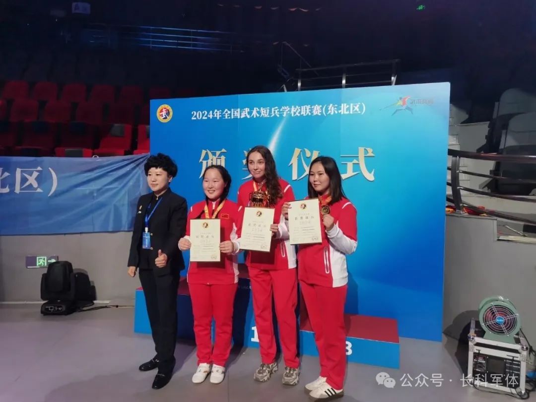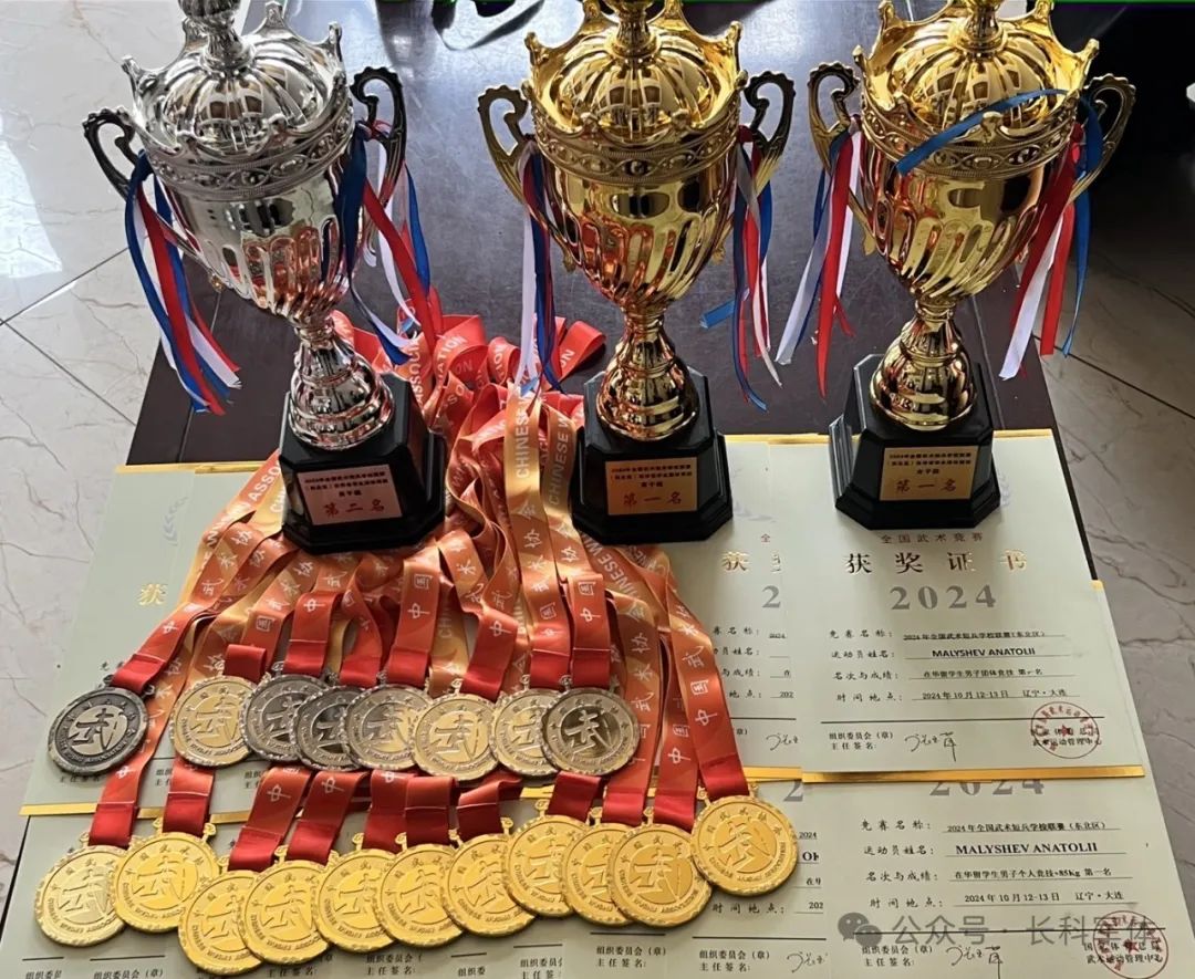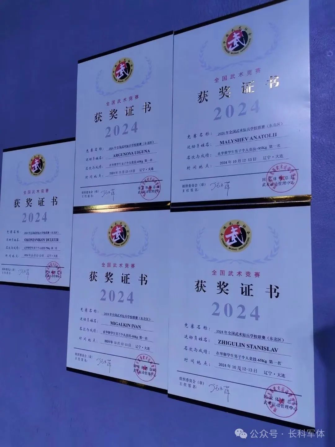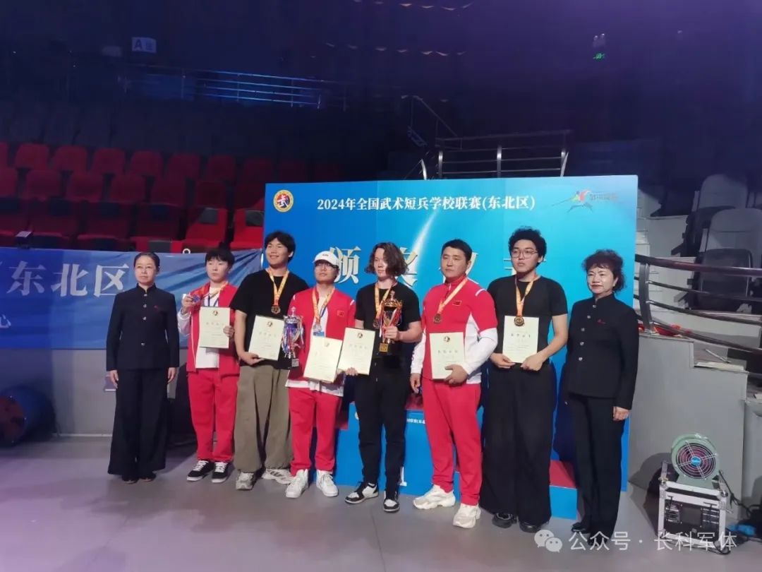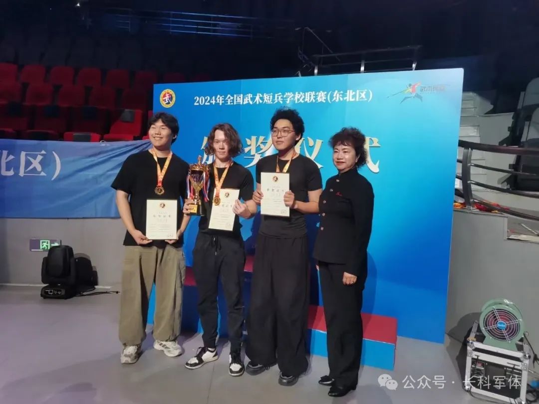 随着比赛的推进,双方每一次精准的进攻、巧妙的身法转换、有力的防守反击,都引得现场的气氛愈加紧张而激烈。最终,我校留学生在全国留学生武术短兵东北区比赛中共获得7金,5银,1铜,我校男子团体派出两支队伍参赛,包揽冠亚军,女子团体派出一支队伍参赛,喜获冠军!