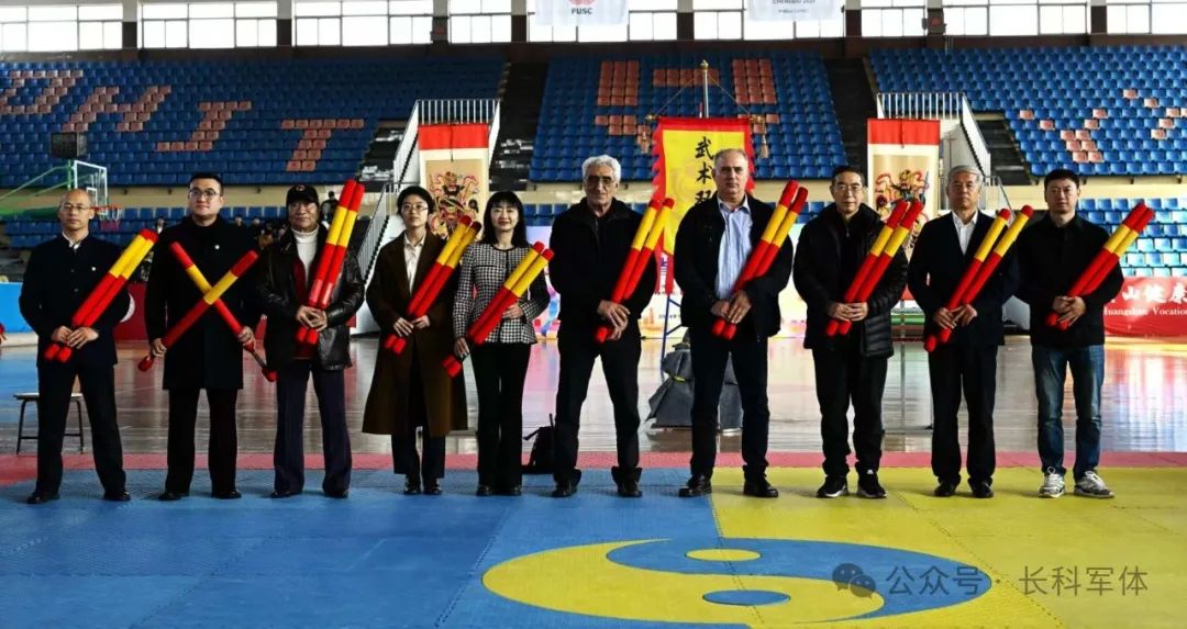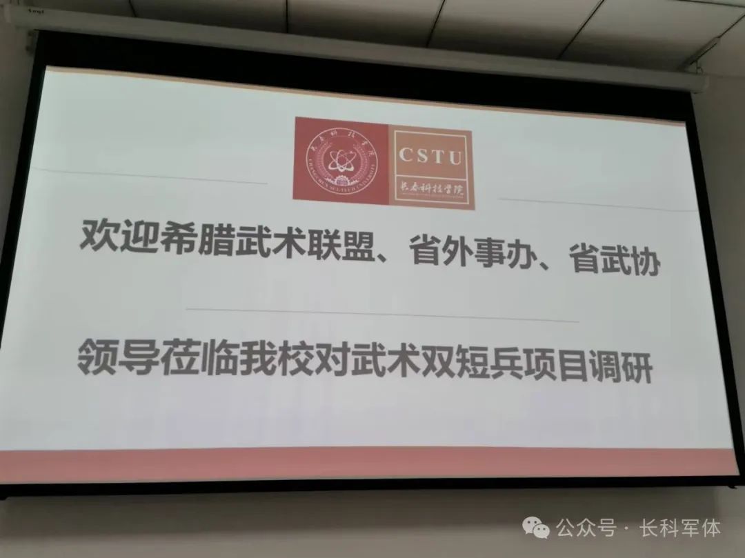 2024年11月15日,希腊武术功夫联盟首席顾问乔治斯.斯皮诺达卡斯,International公司总经理迪米特里斯.帕帕多普洛斯,中国武术文化传播人武文君,吉林省人民对外友好协会秘书长何彦宏,吉林省武术协会主席徐万东,吉林省武术协会党委书记张守智,吉林省武术协会副主席徐志宇,省外事翻译汪琪莅临长春科技学院对武术双短兵项目进行调研。长春科技学院副校长张代治、副校长高杰、军事体育部主任孟繁威、国际交流学院院长王志刚、军事体育部公共体育教研室主任刘恩刚与军事体育部办公室主任严尚滨参加了本次调研。