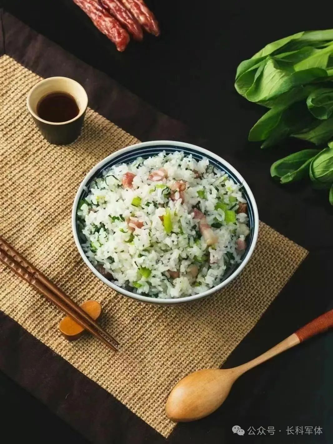 清明祭祖少不了菜饭,菜饭中用的主要食材有应季鲜蔬和腌制腊味,菜饭蒸好之后的颜色清白分明,不仅有“咬春尝鲜”的寓意,还有“气朗神清”的象征意义。