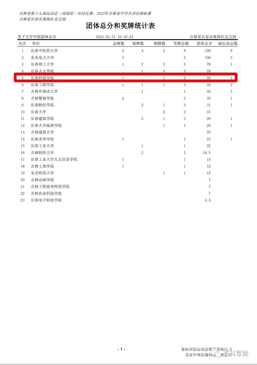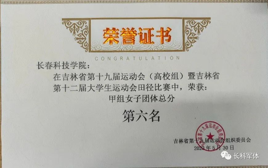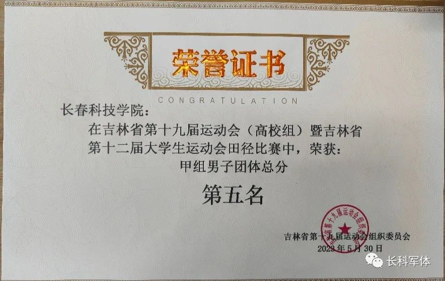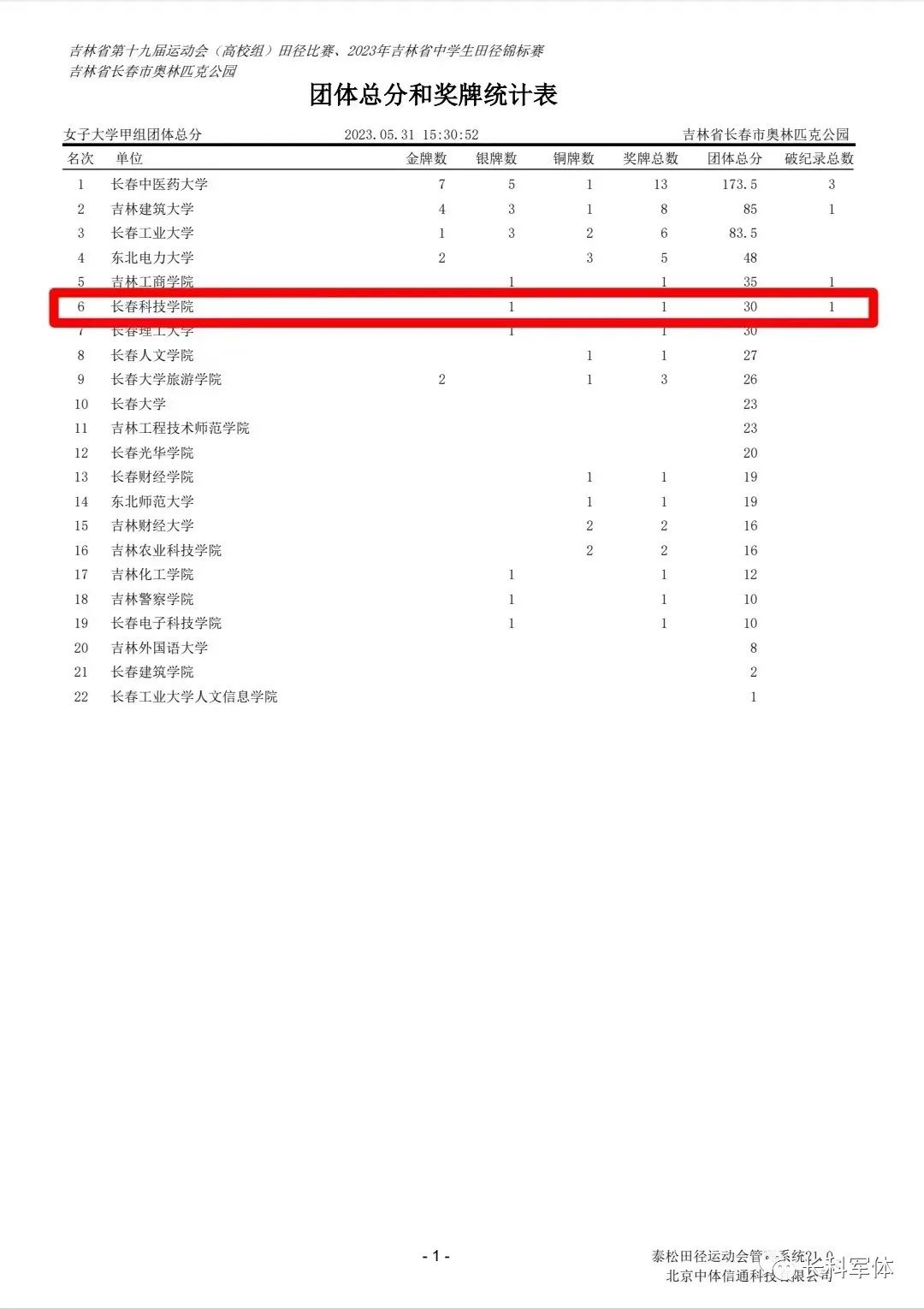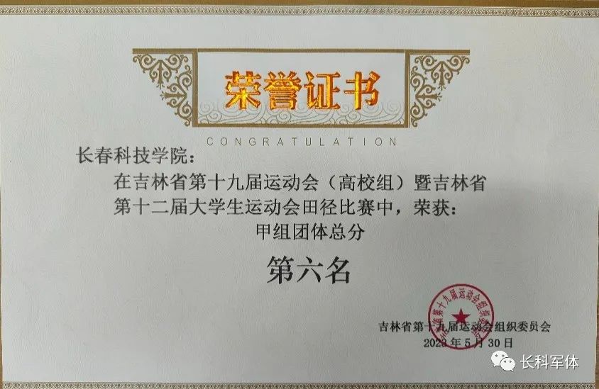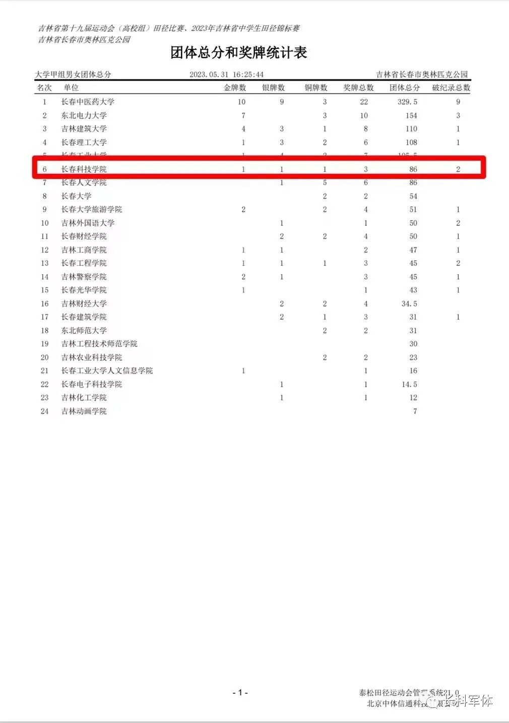 2023年5月27日至30日,由省教育厅主办、省学生体育协会执行的吉林省第十九届运动会(高校组)暨吉林省第十二届大学生运动会田径项目比赛在长春奥林匹克公园举行。本次比赛全省54所高校、57支队伍、1049名田径运动员齐聚一堂,我校运动员在比赛中共获一金一银一铜,甲组团体总分第六名的好成绩,喜获佳绩!