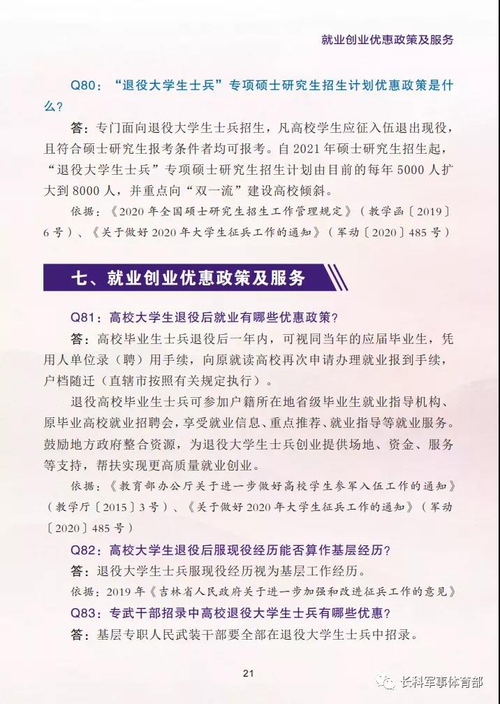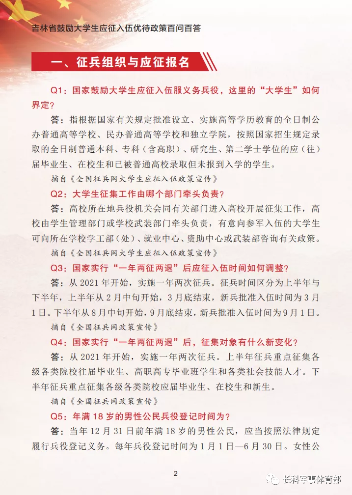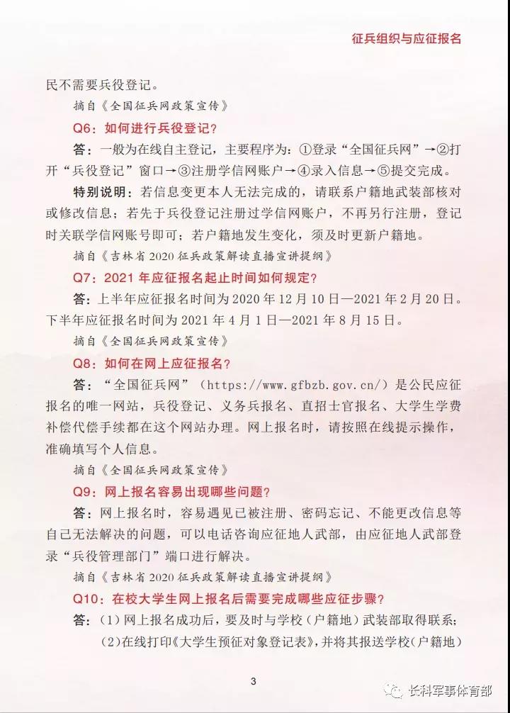 2021年,国家实施“一年两次征兵两次退役”改革,上半年应征报名时间为2020年12月10日 至 2021年2月20日;下半年应征报名时间为2021年4月1日 至 2021年8月15日。目前,第一阶段的征兵工作已全面启动,请同学们及时登录全国征兵网(http://www.gfbzb.gov.cn/)进行网上兵役登记和应征报名。相关政策可通过以下4种方式咨询:查阅《吉林省鼓励高校大学生应征入伍优待政策百问百答》;到县级以上人民政府征兵办公室或高校武装部现场咨询;向班级辅导员咨询;拨打吉林省征兵政策咨询电话。