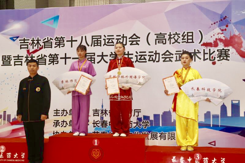 2018年5月15日,吉林省第十八届运动会(高校组)暨第十一届大学生运动会武术项目比赛在长春中医药大学体育馆进行。我校外国语学院15级英语2班殷浩渺同学凭借出色的发挥,获得了个人项目女子甲组初级长拳和初级剑术两块铜牌的优异成绩。