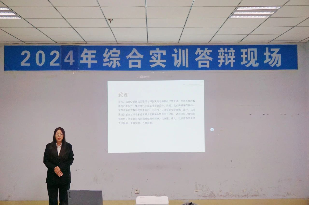 为检验学生学习成果,提高学生专业知识综合运用能力,根据人才培养目标和教学基本要求加强规范化管理,展现我院高质量组群式项目教学的阶段性成果,2024年12月22日,视觉艺术学院2021级美术学和设计类专业综合实训答辩在图书馆教学区进行,视觉艺术学院院长李文成以及全体专业教师参与了此次答辩评审工作。