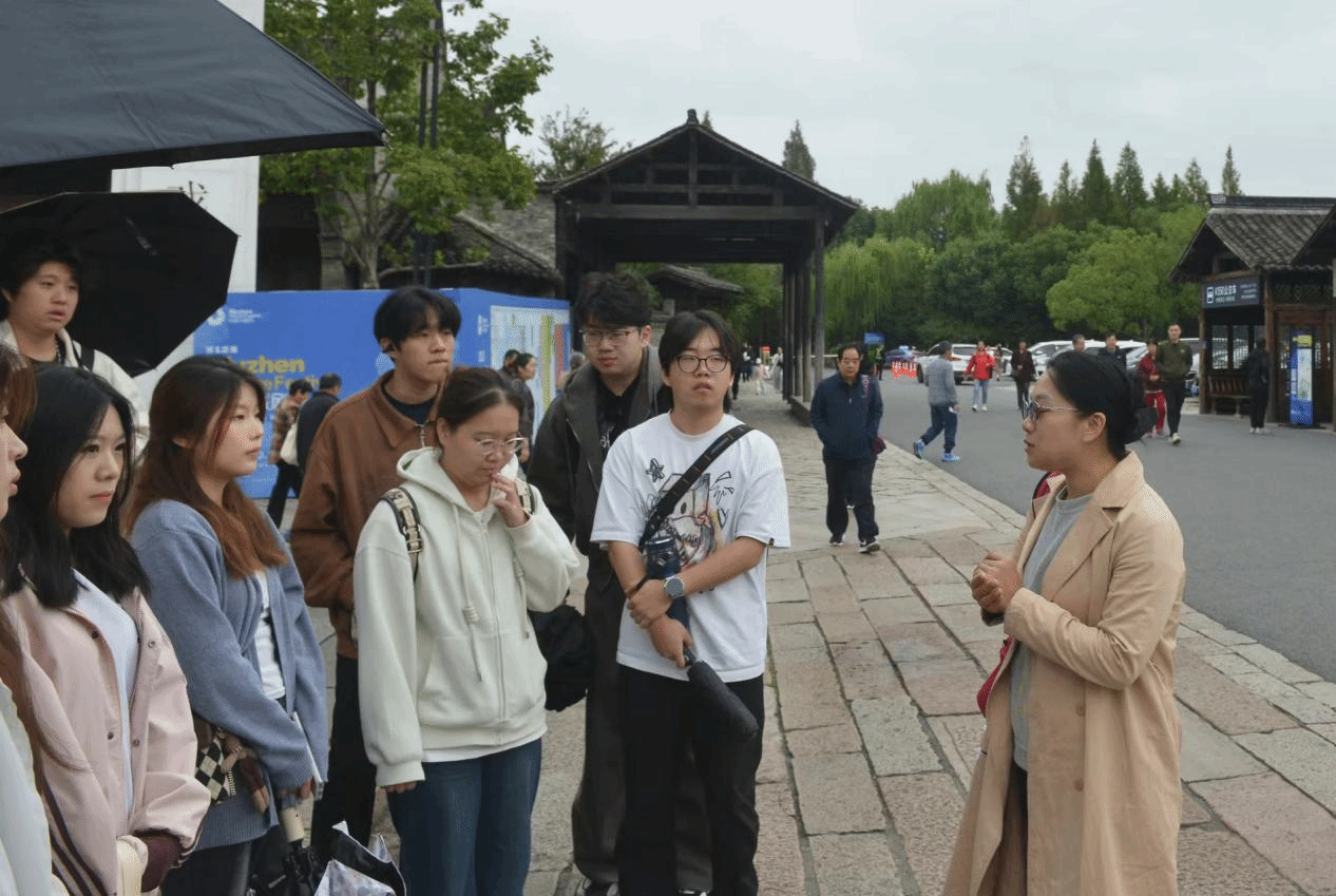 视觉传达设计、数字媒体艺术、环境设计、建筑学专业师生,从上海、杭州,到苏州,在都市光影、学府人文、水乡诗意与园林雅致中,完成了一次从课堂到现场的跨越。同学们走进中华艺术宫,在东方之冠的宏伟结构与丰富展陈中,感受经典与现代的艺术对话。外滩的夜景则成为一堂生动的光影设计课,同学们专注记录灯光与建筑的互动,思考光艺术在城市空间中的表达。在杭州,中国美术学院的校园与国际设计博物馆成为灵感源泉。同学们在展厅中研究动线布局、视觉呈现,在校中体会建筑与环境的和谐共生,以及中国传统元素的应用。西湖的自然景观更成为理解艺术源于生活的生动教材,大家在湖光山色中体会建筑与环境的和谐共生。乌镇的小桥流水、白墙黛瓦构成一幅流动的水墨长卷。同学们漫步石板路,探访传统手工作坊,也在当代艺术展馆中寻找传统与现代的共鸣。
