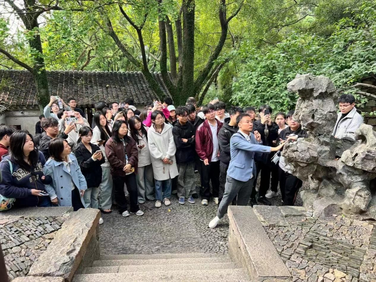 在苏州,拙政园与贝聿铭设计的苏州博物馆成为古典与现代融合的典范。尤其在虎丘拥翠园,学院邀请苏州松隐园林营造项目负责人马老师,带来一场生动的移动课堂,让同学们深入理解古典园林的营造智慧,从假山堆叠到亭台布局,从理念到技艺,收获满满。