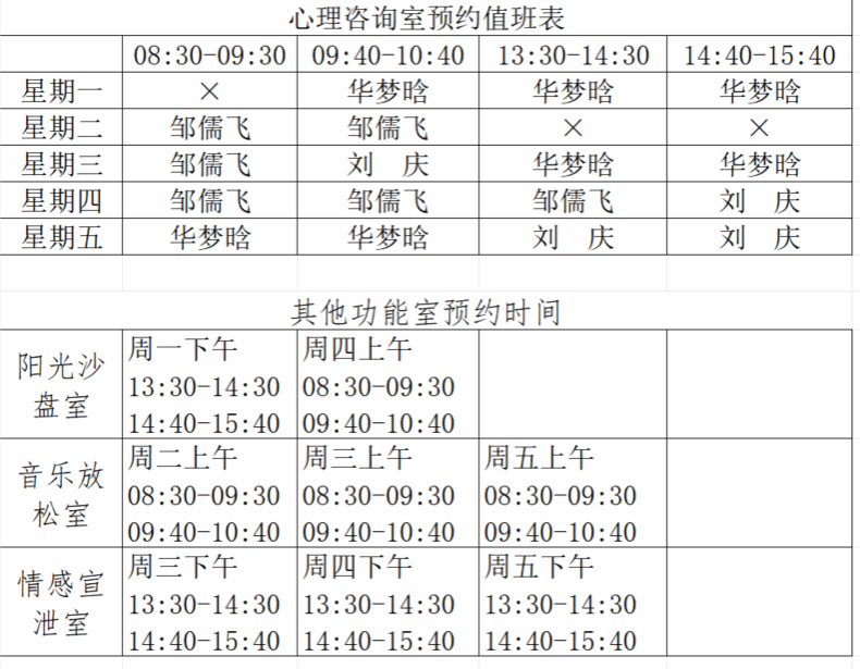 注:本日历仅为本学期法定工作日咨询时间,如有特殊情况,咨询师及咨询时间会有所调整,以实际为准。