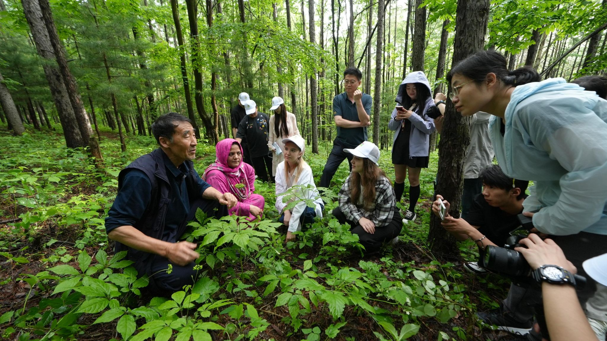 活动首日,师生们走进大顶子野山参基地,在国际级非物质文化遗产长白山采参习俗代表性传承人赵炳林老师的讲解下,大家学习识参、认参,亲手参与林下采参实践,感受“喊山”“绑红绳”等传统习俗的魅力。细雨中的原始森林更添神秘,同学们深刻领悟到“森林-土壤-微生物”共生体系的生态智慧,也对人参文化的传承与保护有了更深的敬意。