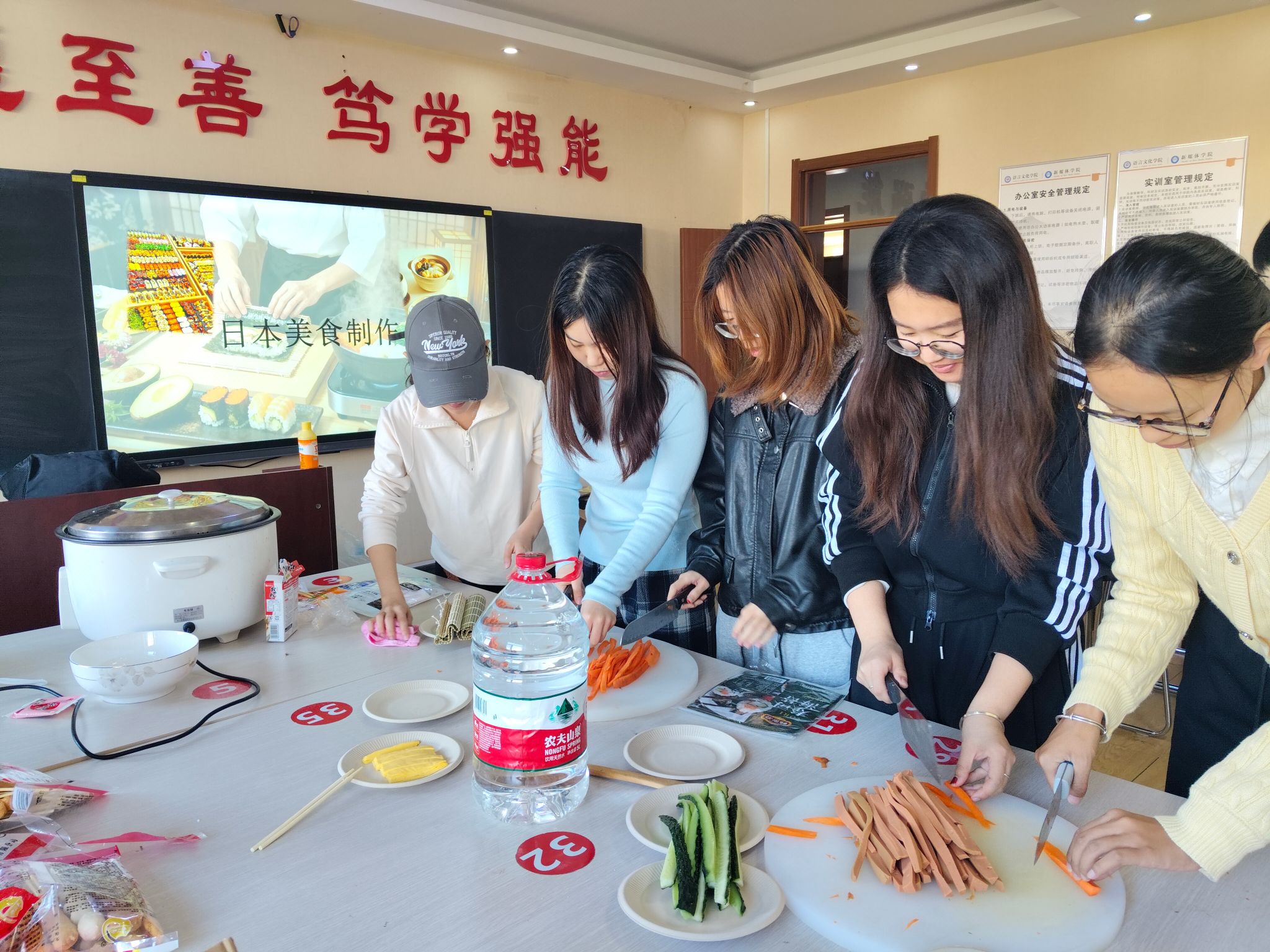 活动前,大家早已分工协作,提前采购好新鲜食材,各类厨具也整齐摆放,静静等候“大厨们”上场。待所有人齐聚教室,实践正式开始,无论此前是否接触过日本料理,每个人都带着好奇与热情踊跃尝试。