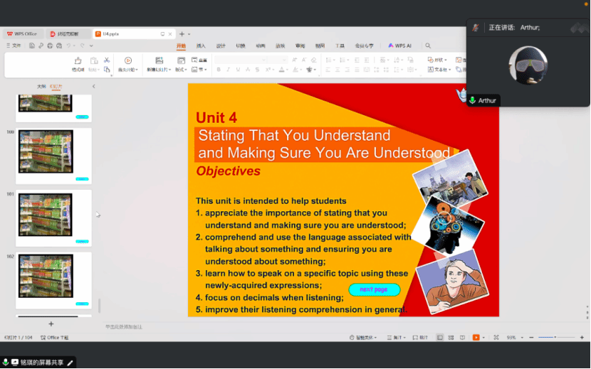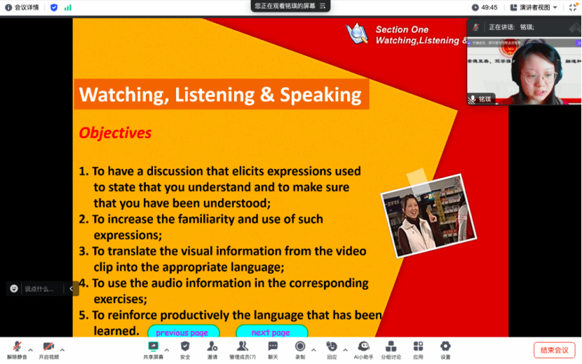 此次线上磨课涵盖了英语专业的多门核心课程。教师们精心准备,通过腾讯会议平台进行教学展示,详细阐述教学设计思路与课堂实施计划。在磨课过程中,教师们注重教学方法的创新,采用多样化的教学手段激发学生的学习兴趣,提高学生的参与度。例如,有的老师运用案例教学法,将实际生活中的英语应用场景引入课堂;有的教师则借助多媒体数字和AI资源,为学生提供丰富的视听材料和英语训练内容