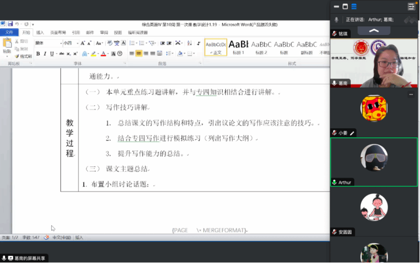 陈杰:今天的磨课活动让大家能够集思广益,受益匪浅。每位老师的讲解都有其独特的特色和亮点,许多教学方法和教学设计值得我们借鉴与学习。结合《综合英语II》的教学,我将进一步根据学生的特点完善教学活动设计,尤其是加强本单元各部分之间的衔接与连贯,并继续探索人与自然的关系以及文化遗产两个方面,将课程思政有机融入课堂教学中