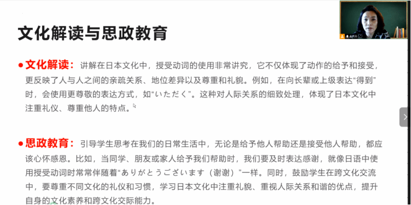在磨课过程中,日语专业的每位教师都精心准备了一堂展示课。课程涵盖了基础日语、日语会话、日语笔译研究与实践等多个核心领域课程,充分展现了日语专业丰富多样的课程体系。教师们凭借扎实的专业知识、新颖的教学设计和生动的教学方法,以及具有特色的课程思政设计,为大家呈现了一场场精彩纷呈的日语课堂。