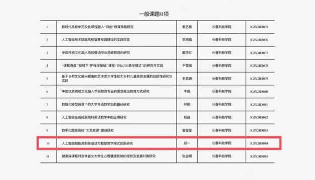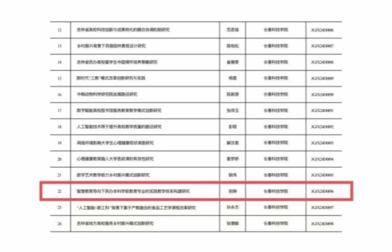 在此次高等教育科研课题立项中,我院共申报了32项课题,其中教师11项,学生21项,在院领导的积极动员与领导下,根据吉林省教育厅公布2024年度吉林省高等教育科研课题立项名单,我院共有22项课题获批立项,其中重点自筹课题1项、一般课题21项。现将结果公示如下。