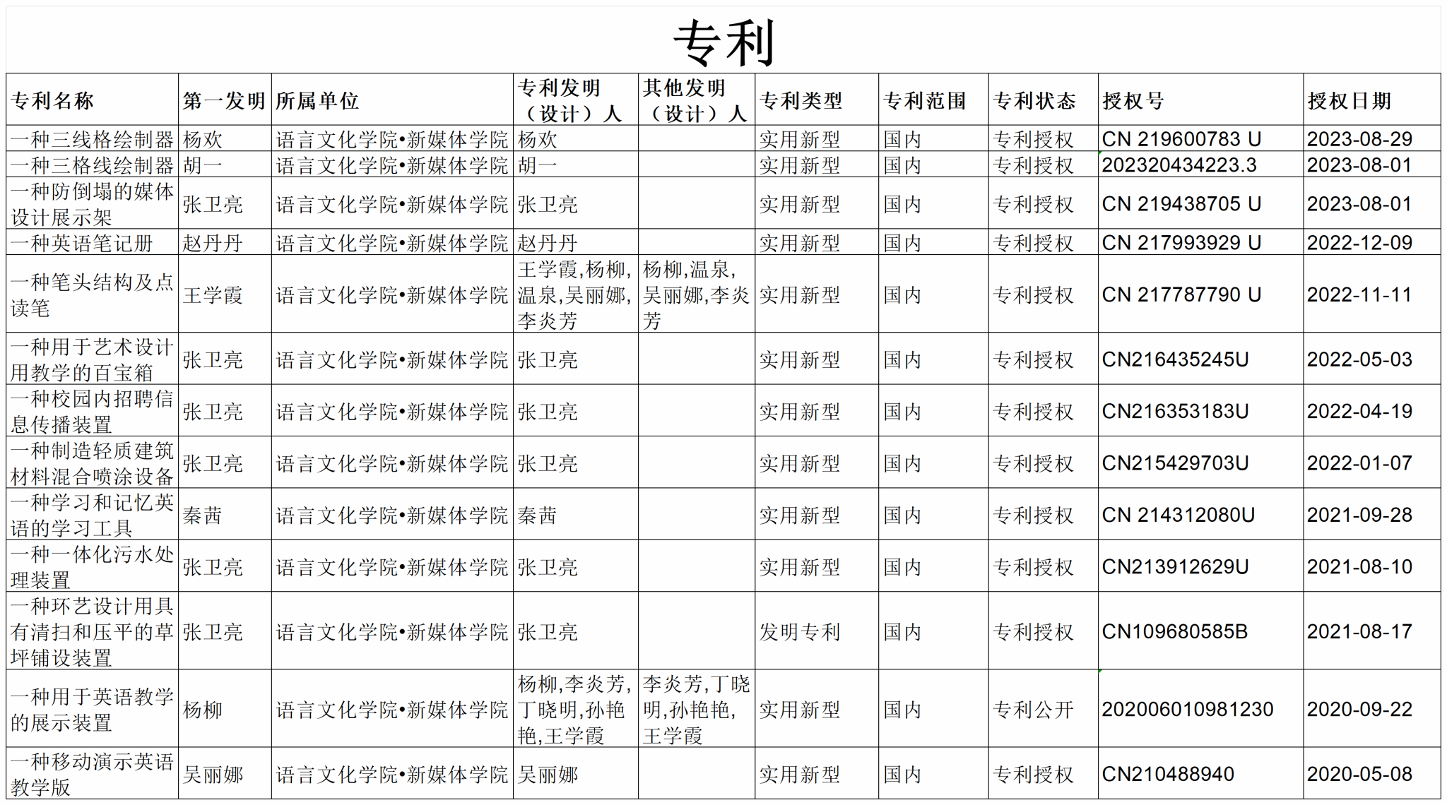 发表专著9篇,译著1篇,编著9篇,教材9部。专利13项(实用新型12项,发明专利1项)。软著1项。