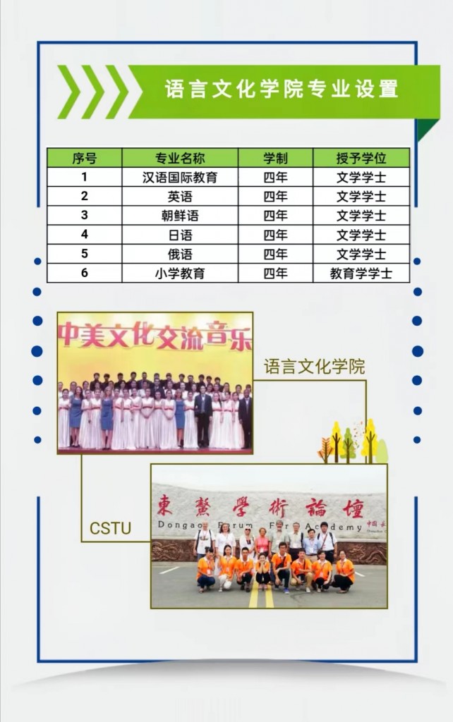 语言文化学院•新媒体学院设有英语、俄语、日语、汉语国际教育、小学教育、学前教育、网络与新媒体等7个专业。学院旨在培养宽视野、高素质、精语言、善写作、能融通、会创新、善创新、懂技术,能够适应国家和吉林省经济建设和社会发展需求的应用型、复合型、融合型人才。学院在校生1473人,教师63人,博士13人(含在读),高级职称34人。学院拥有教育部行指委委员、教育部师范认证专家、省级教学名师、市突出贡献专家等。荣获吉林省社科优秀成果二等奖等科研奖励10余项,获吉林省教学成果一、二、三等奖各1项。近年来学生就业率稳定在93%以上。学院重视国际化办学,与俄罗斯东北联邦大学,俄罗斯远东渔业国立技术大学,俄罗斯克拉斯诺雅尔斯克农业大学,英国桑德兰大学、马来西亚UCSI大学、马来西亚世纪大学、泰国格乐大学、泰国诗纳卡琳威洛大学,韩国建国大学、韩国釜山外国语大学、韩国南首尔大学、韩国湖西大学、韩国明知大学、韩国世翰大学,日本城西大学、日本京都信息大学院大学等合作,长期开展交换生、双学位及本硕连读项目。