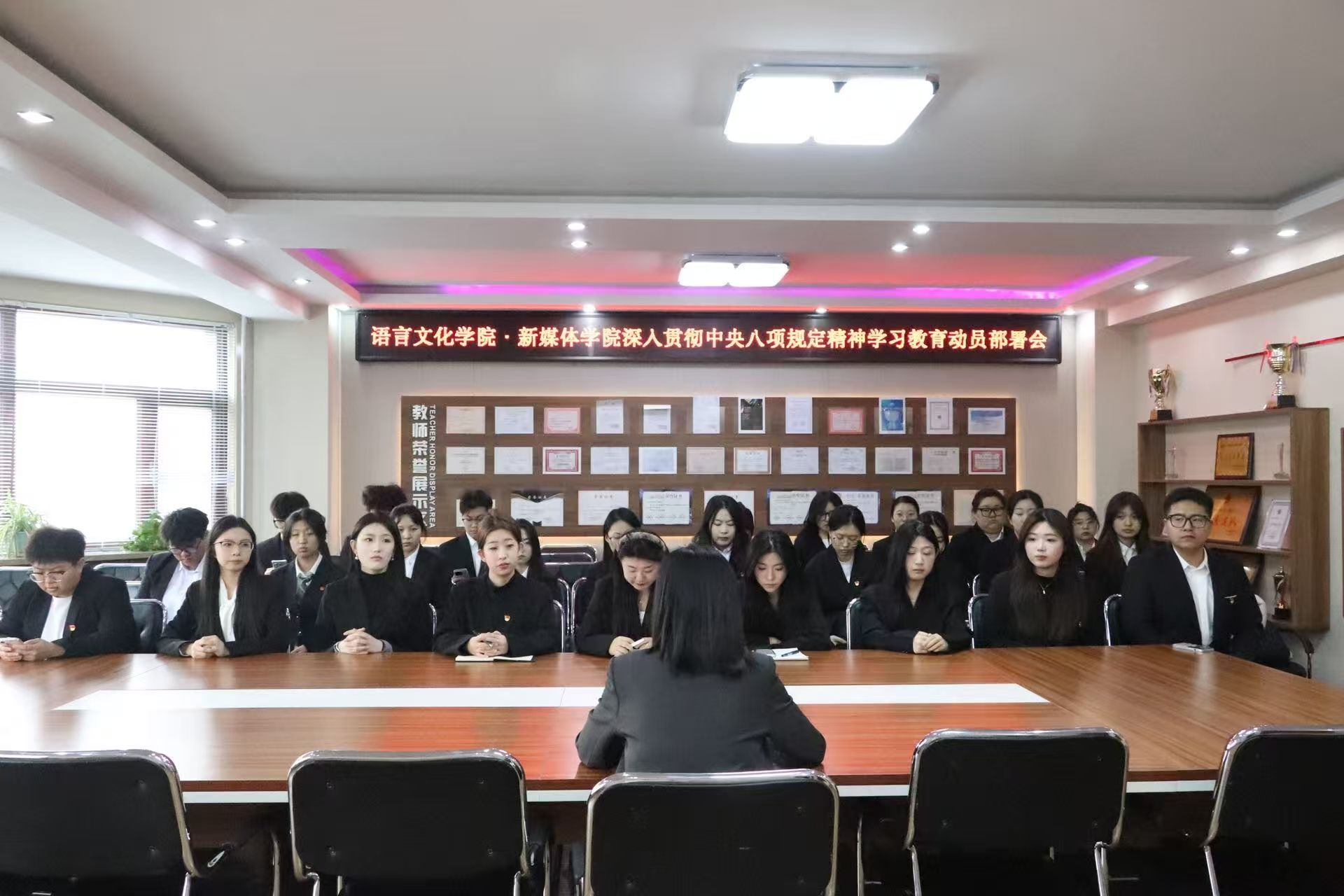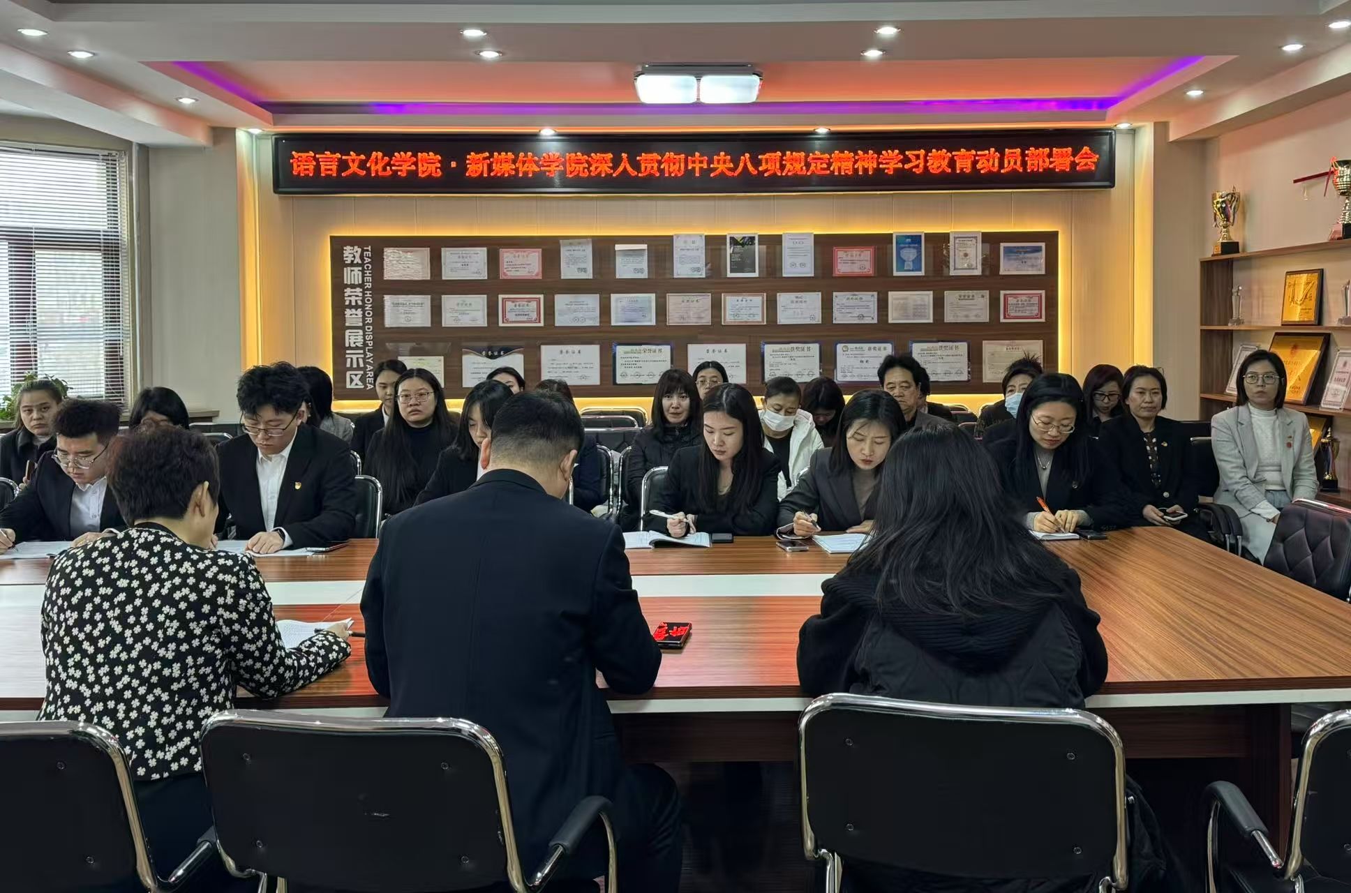 根据省委办公厅印发的《吉林省深入贯彻中央八项规定精神学习教育实施方案》精神,按照省委教育工委和学校党委要求,为扎实开展好学习教育,推动学院高质量发展,营造风清气正的政治生态和良好的工作作风,语言文化学院·新媒体学院于2025年3月27日11:30召开深入学习贯彻中央八项规定精神学习教育动员部署会。学院党总支书记陈书记作动员讲话,学院领导、各党支部书记、全体教师党员及学生党员参加会议。会议由党总支副书记张贺亮主持。