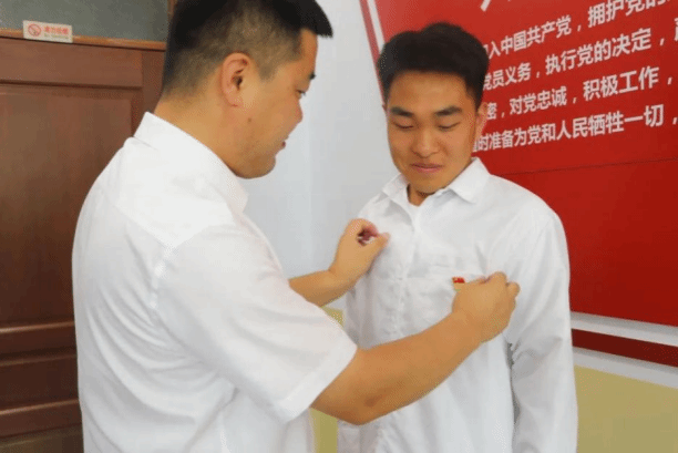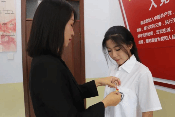 宣誓结束,党员教师为新党员佩戴党徽。