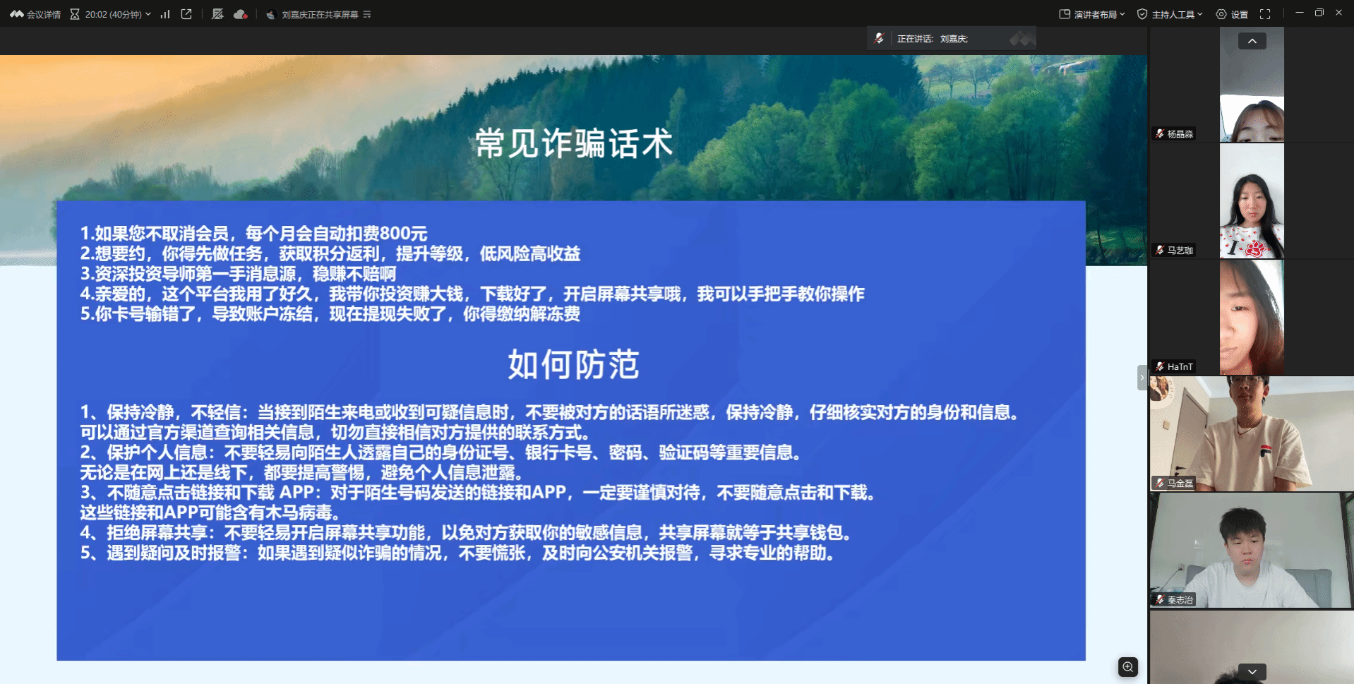学院组织各班级宣传委员开展反诈专题学习会,由学生骨干担任主持人,通过“观看警示教育片+知识讲解+经验分享”三环节深化学习效果。活动中,同学们共同观看国家反诈中心发布的反诈微电影,剖析刷单、冒充公检法等典型诈骗手法;在分享环节,曾亲历诈骗未遂的李同学现身说法:“多亏之前公众号发布的‘防诈宣传’,让我在转账前识破了骗局。”各班级宣传委员还总结出“反诈三原则”——不轻信、不转账、速核实。此外,同学们还自发转载学院制作的反诈平台,让反诈知识“入脑入心”。