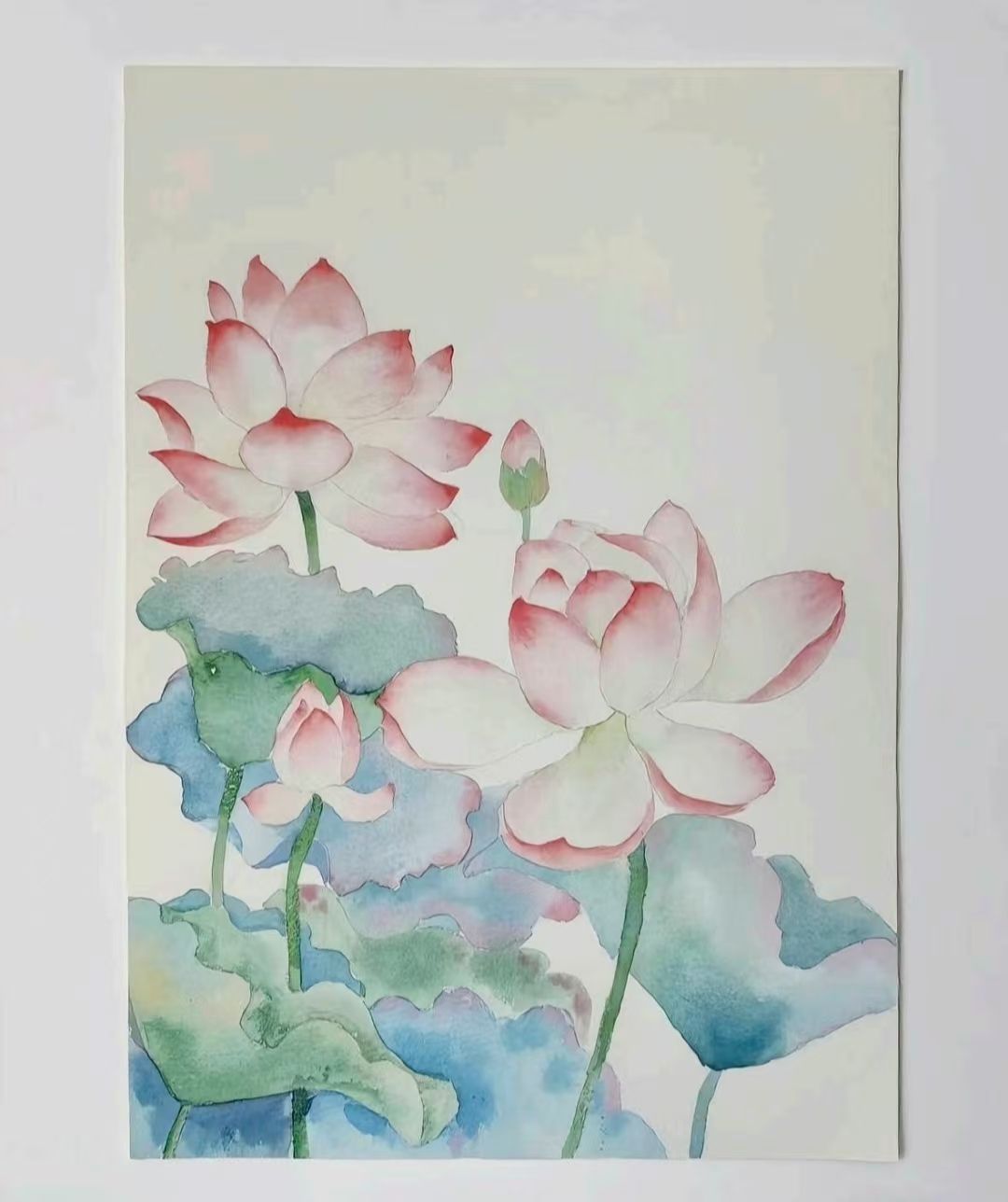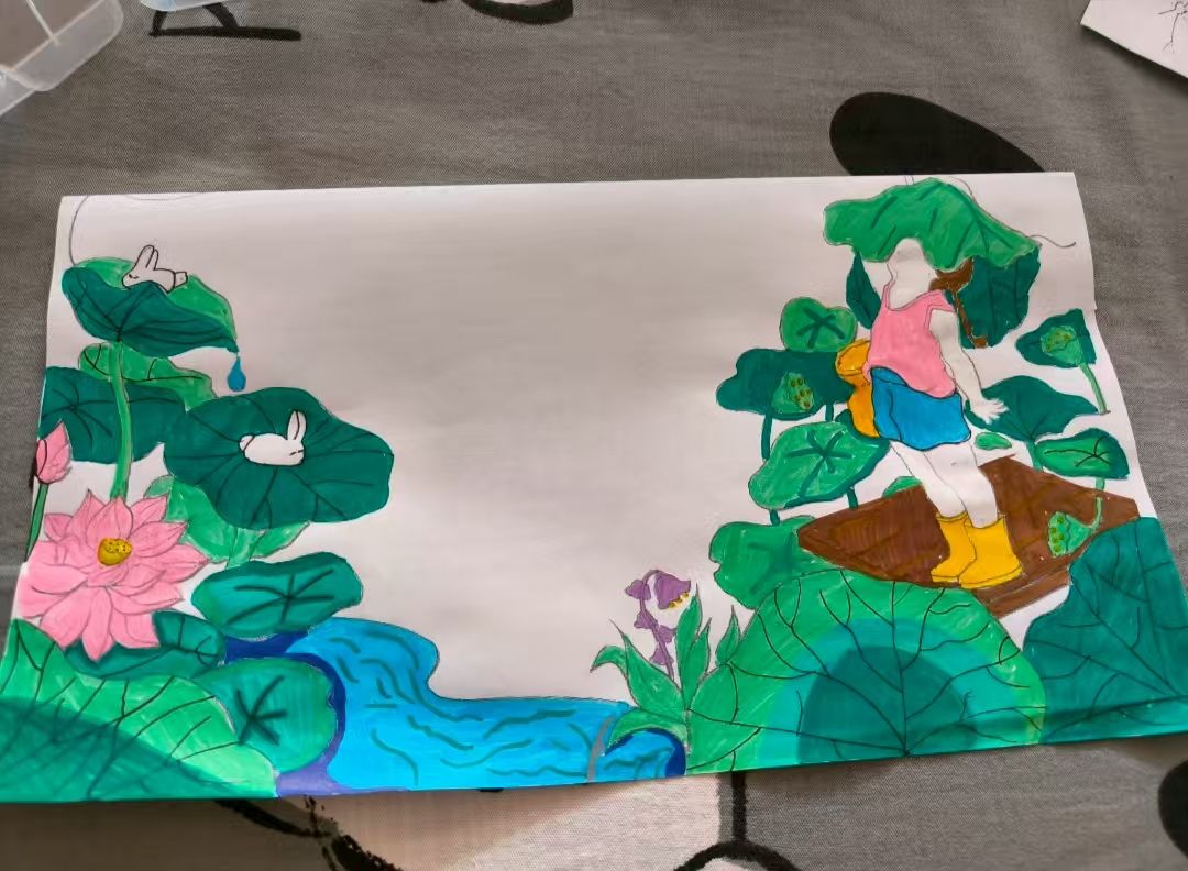 她们或以水彩晕染荷花的清雅,让留白盛下夏日宁静;或以水墨皴擦荷的枯荣,借苍劲荷梗传递东方意趣;或添白兔、女孩入荷塘,用童趣激活自然生态。这些创作让荷花走出传统意象,在童真与诗意间,绽放成新的风景。