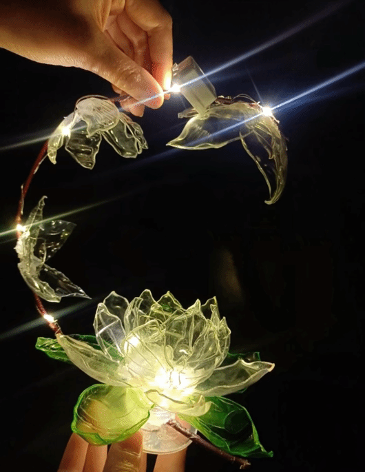 受莲花“出淤泥而不染”的意象启发,结合环保理念,将废弃塑料瓶变废为宝。让原本丢弃的“垃圾”成为点亮生活的艺术装置,实现美学价值与环保价值的融合。