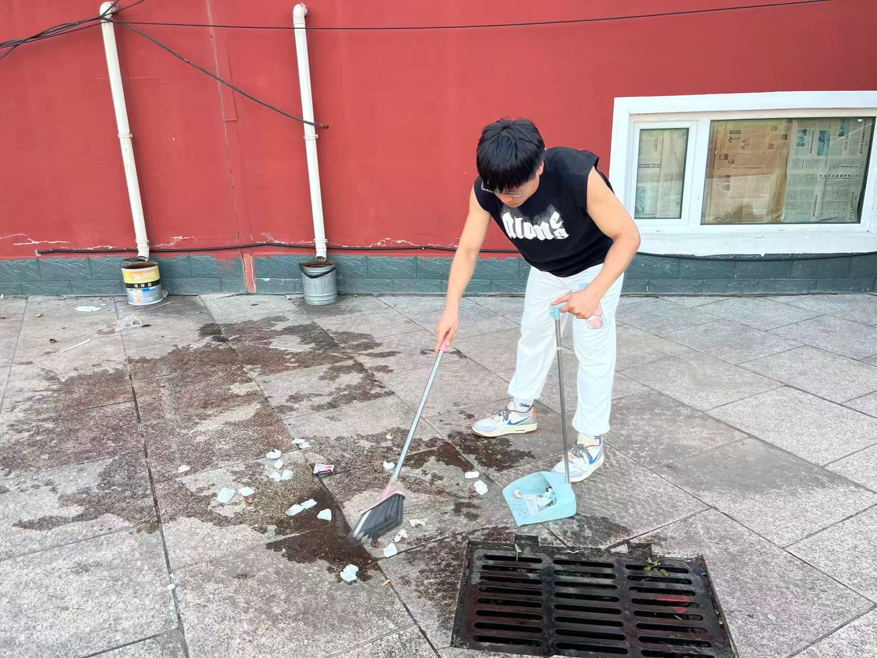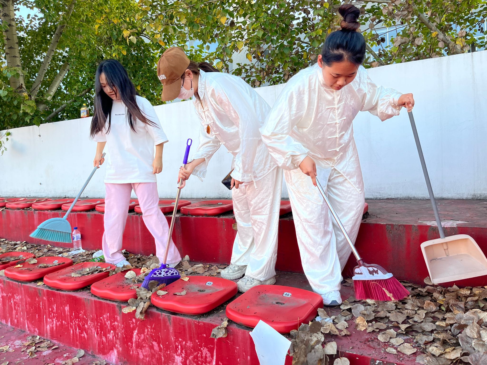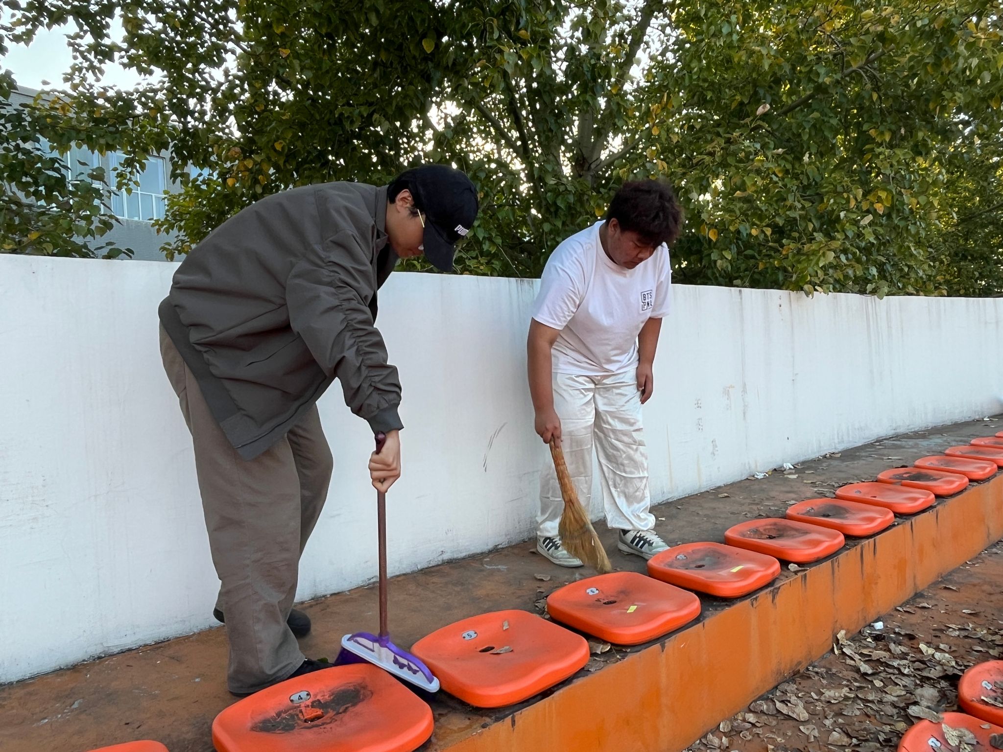 活动过程中,同学们手持扫帚、簸箕等清洁工具,分组分散于看台各区域展开清理。大家细致清扫台阶上的纸屑、果皮等杂物,将其归拢后统一装入垃圾袋;对于粘附在地面的顽固污渍,更是俯身用手仔细清除,不遗漏任何细微角落。座椅清洁同样一丝不苟,从靠背到椅面,乃至边缘缝隙,均经过反复擦拭,彻底去除积尘与污渍。面对散落的垃圾和落叶,同学们发扬不怕脏、不怕累的精神,齐心协力、默契配合,使原本杂乱的观众席逐渐恢复整洁有序。