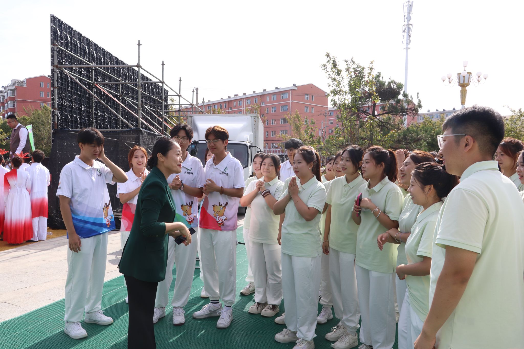 演出结束后,双阳区委宣传部副部长狄晓丽亲切慰问了我院参与合唱的师生,对同学们的精彩表现和学院的精心组织给予高度评价,并充分肯定了长春科技学院在校地合作、实践育人方面的积极贡献。她表示,高校参与地方文化建设,不仅丰富了活动内涵,也为学生提供了宝贵的实践平台,真正实现了“共建共享、协同育人”的目标。