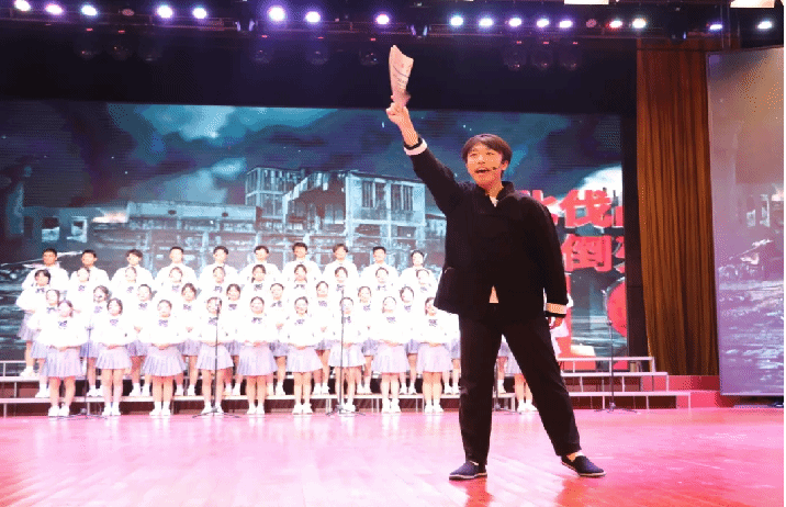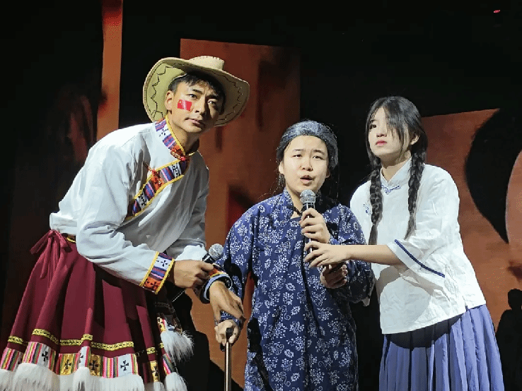 此次朗诵中还巧妙地融入了情景剧。几位同学分别扮演不同人物依次登场,有卖报青年、老奶奶及其孙女,还有一位来自西藏的年轻人,他们的身影与朗诵声相互交织,仿若历史的见证者,共同绘就一幅壮丽的爱国画卷。