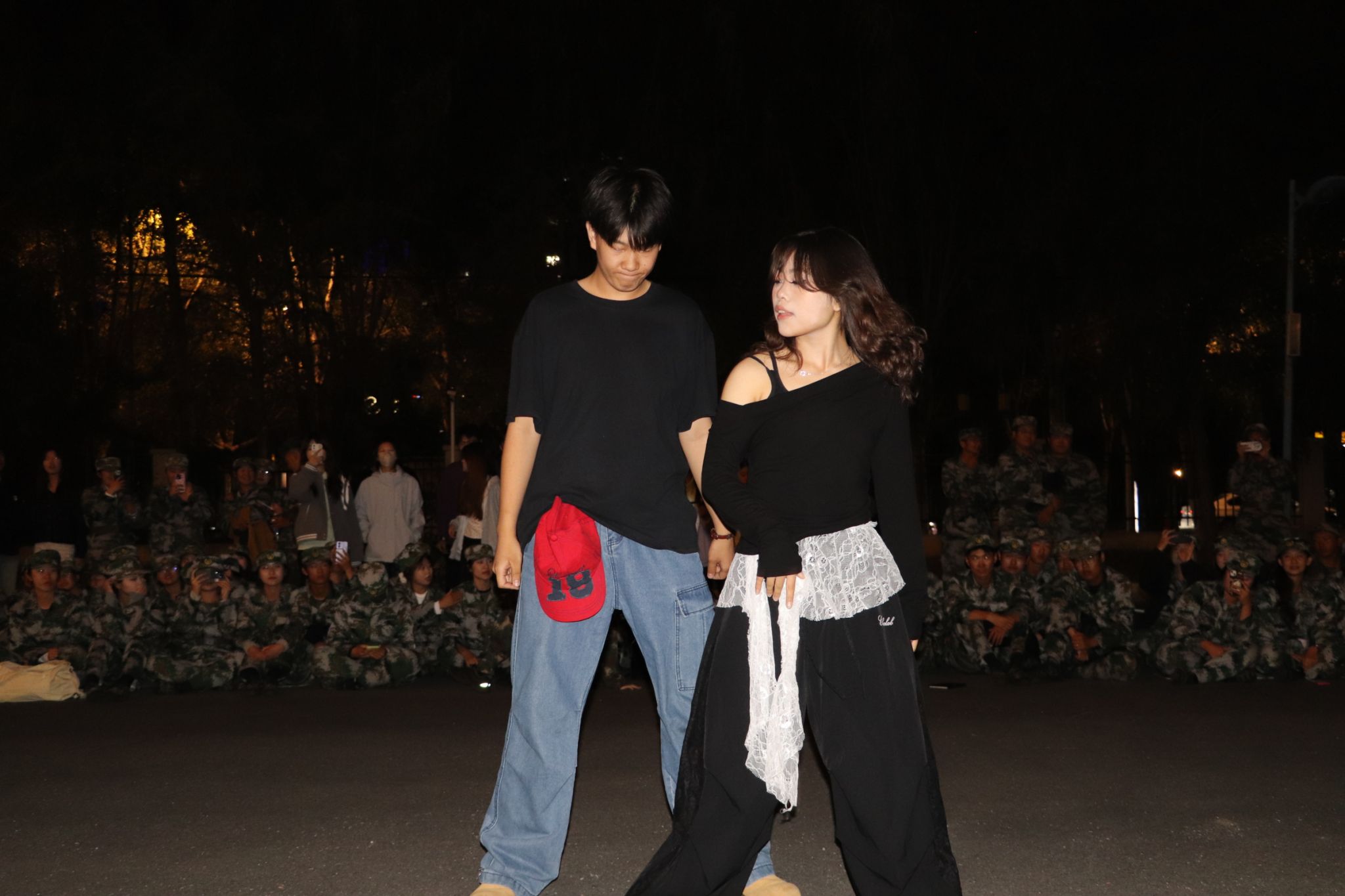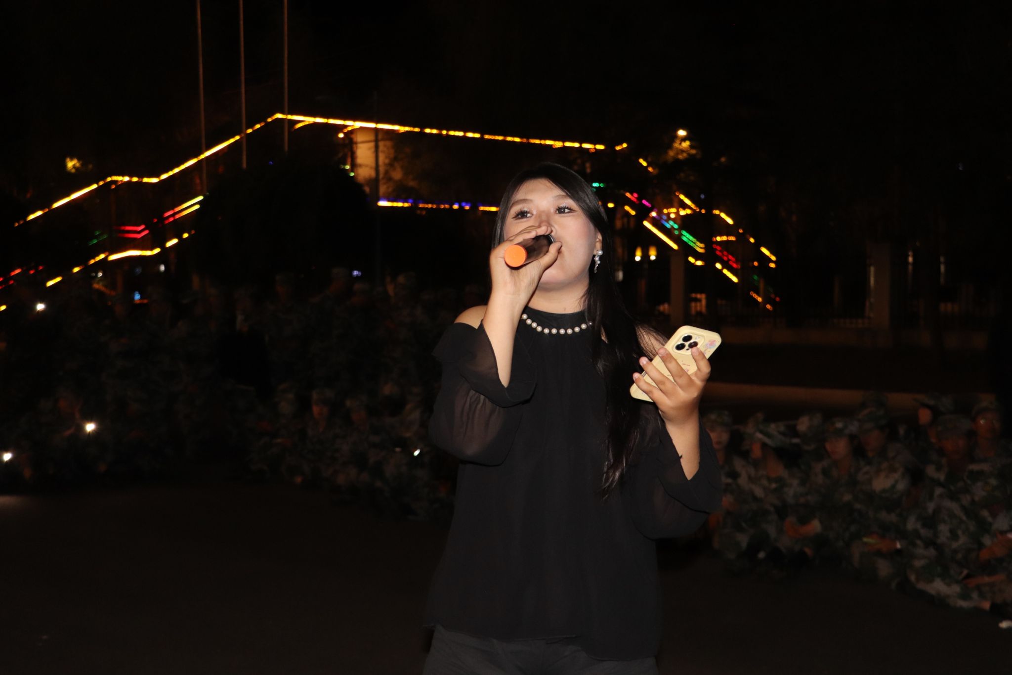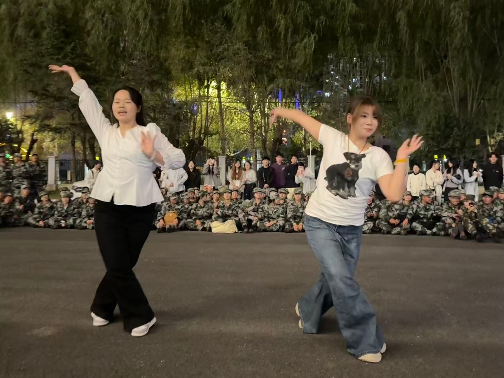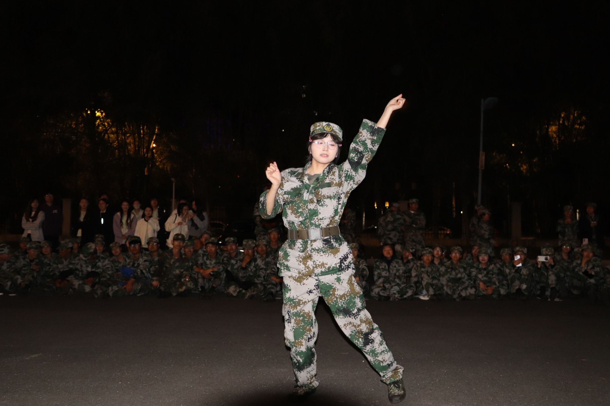 在军训慰问表演中,大一新生同学长学姐一齐登台,带来了歌唱、舞蹈等丰富多彩的节目,用青春活力的演出为高强度训练的新生们送上关怀与鼓励,现场气氛热烈非凡。