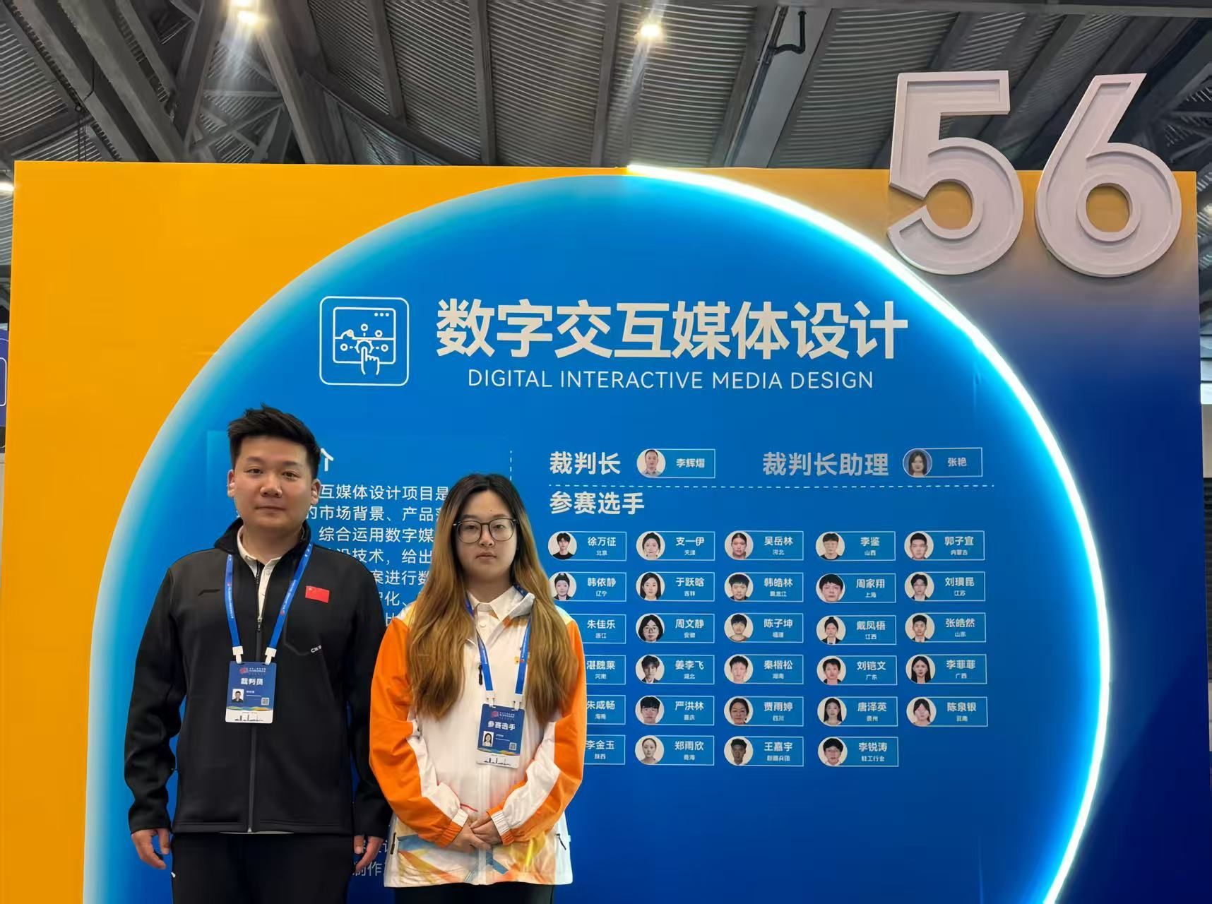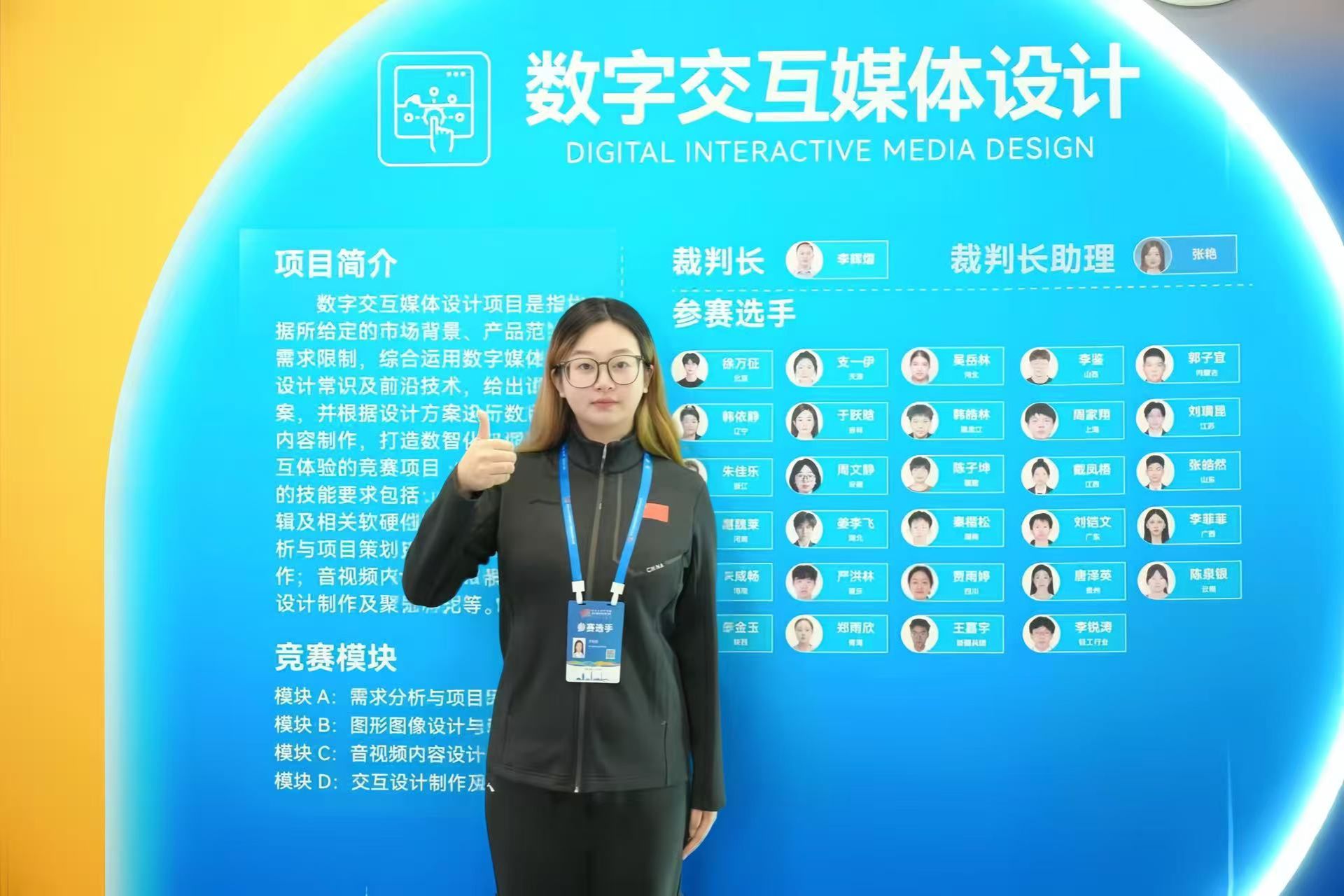 在本次大赛首次设立的世赛项目“数字交互媒体设计”中,网络与新媒体专业学生于跃晗与来自全国众多高校的优秀选手同台竞技。面对全新赛制、缺乏参考经验的挑战,她沉着冷静,依托扎实的专业功底,赢得了评委的一致认可。数字交互媒体设计作为新增的世赛项目,要求选手掌握语言转换、多软件协同操作及代码编写等多重技能。于跃晗在备赛过程中逐一克服了这些困难,通过逐词查阅记忆、严格执行训练计划、反复调试优化程序,最终实现了操作精准、零失误的出色表现。她的获奖证明了我院在数字化人才培养方面的成功探索,展现了学院适应新技术发展的教学改革成果。