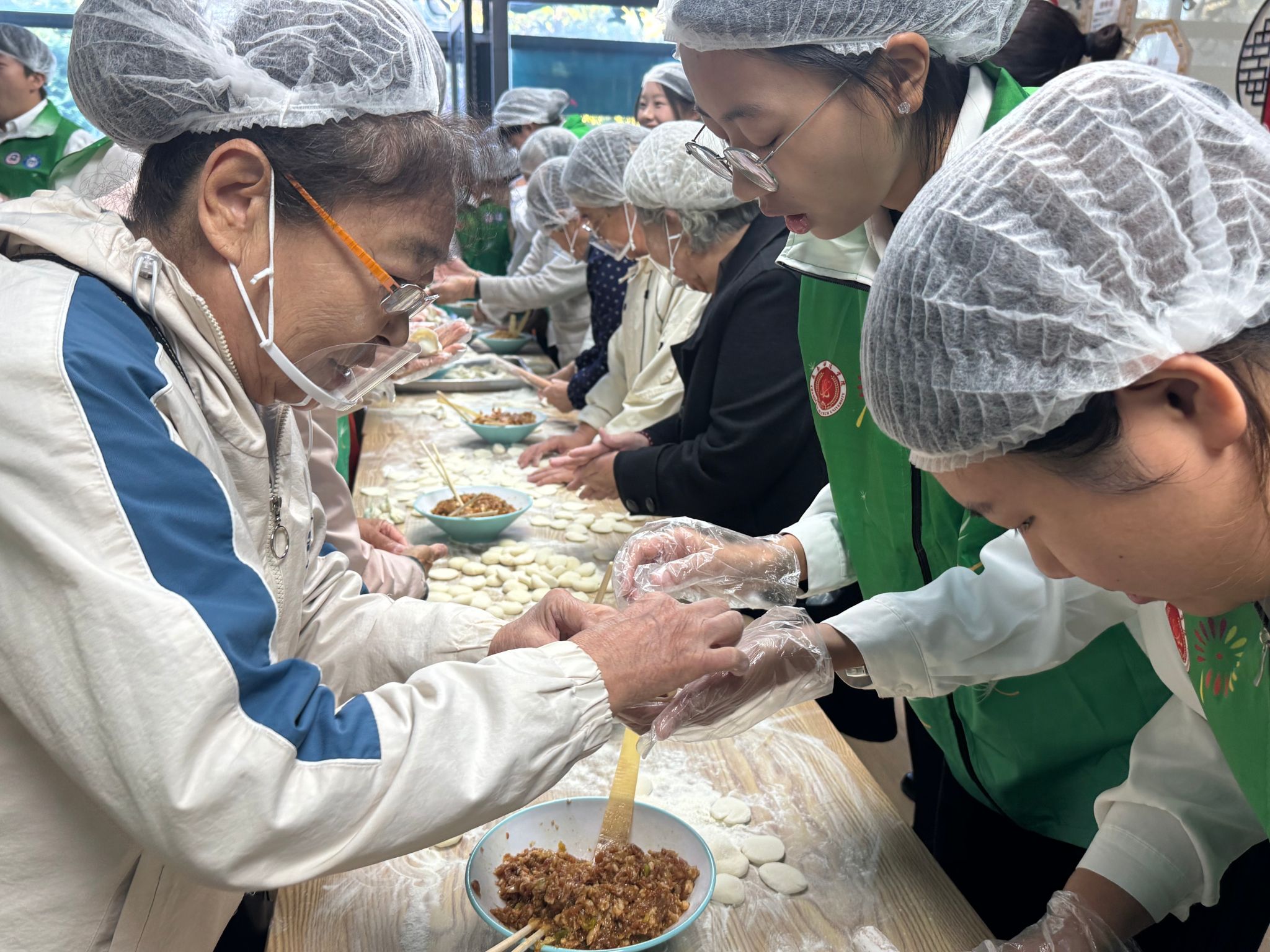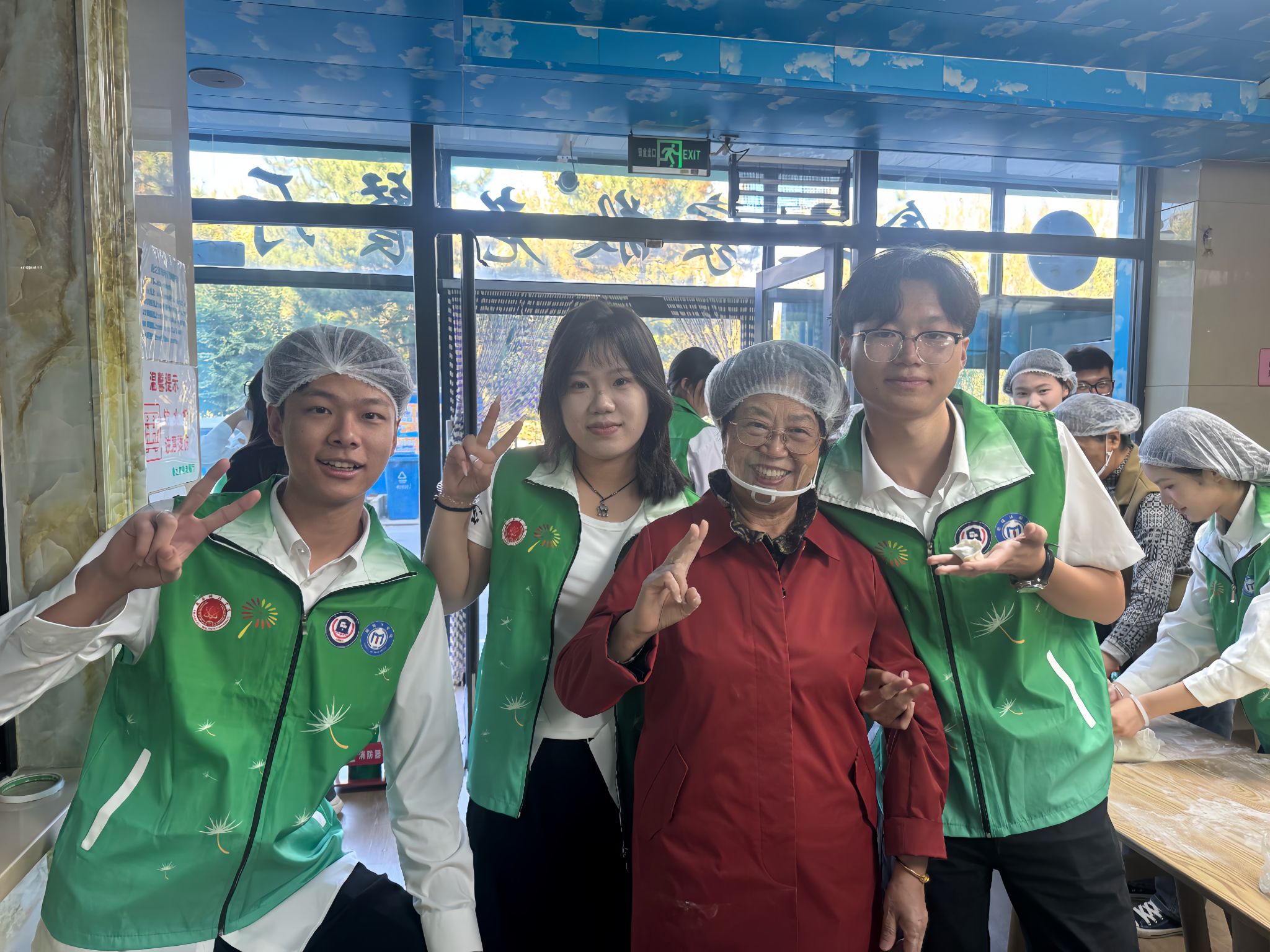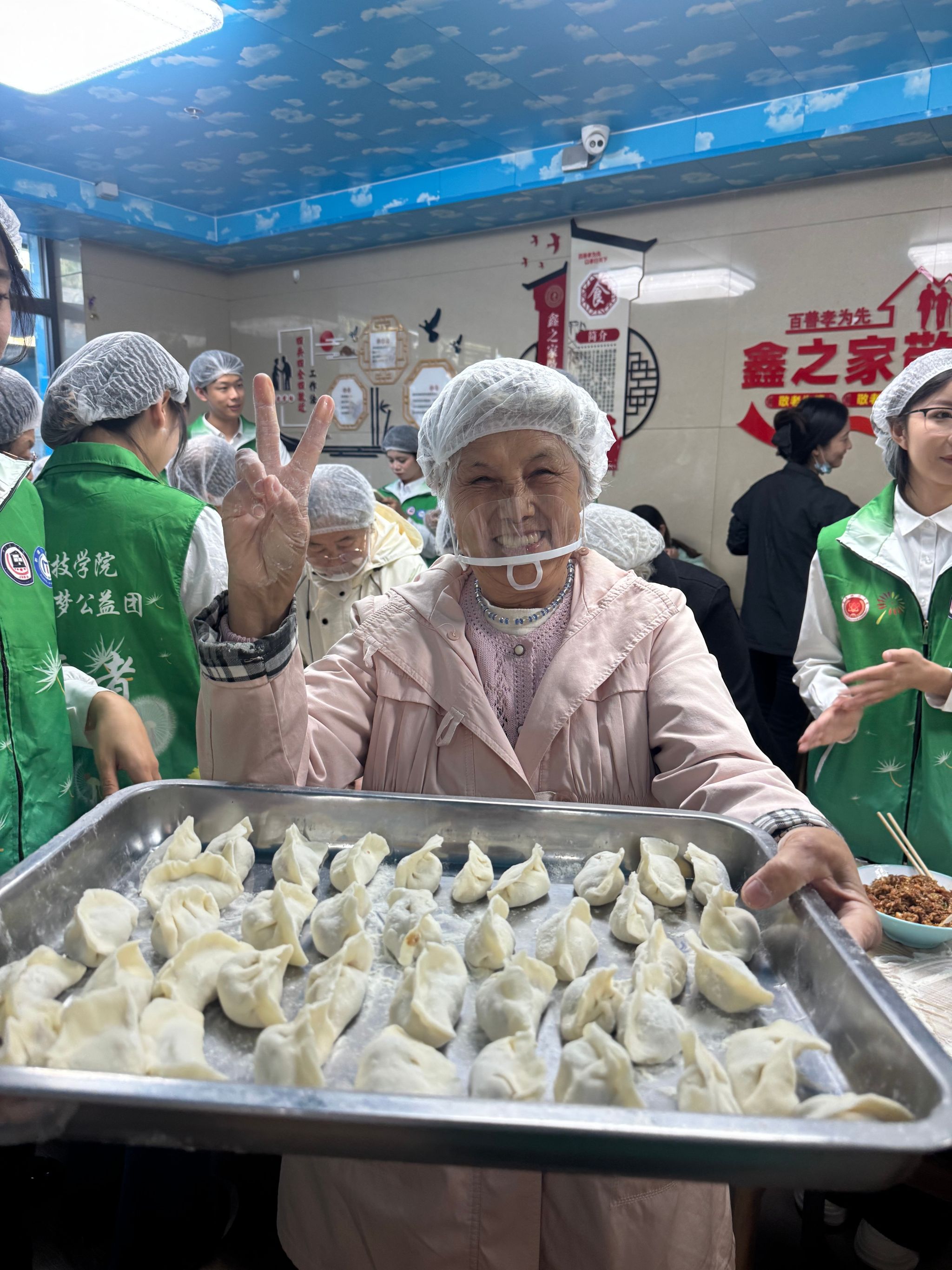 在开展短视频创作的同时,我院蒲公英筑梦公益团前往鑫夕阳养老院开展慰问活动,将专业实践与社会服务深度融合。志愿者们发挥专业特长,为老人们表演了歌曲、舞蹈、朗诵等文艺节目。当《我和我的祖国》旋律响起时,老人们眼含热泪与志愿者齐声合唱,场面温馨感人。表演结束后,同学们还与老人一起包饺子,在亲密互动中传递温暖关怀,这些动人场景也成为“幸福双阳”主题创作的生动素材。