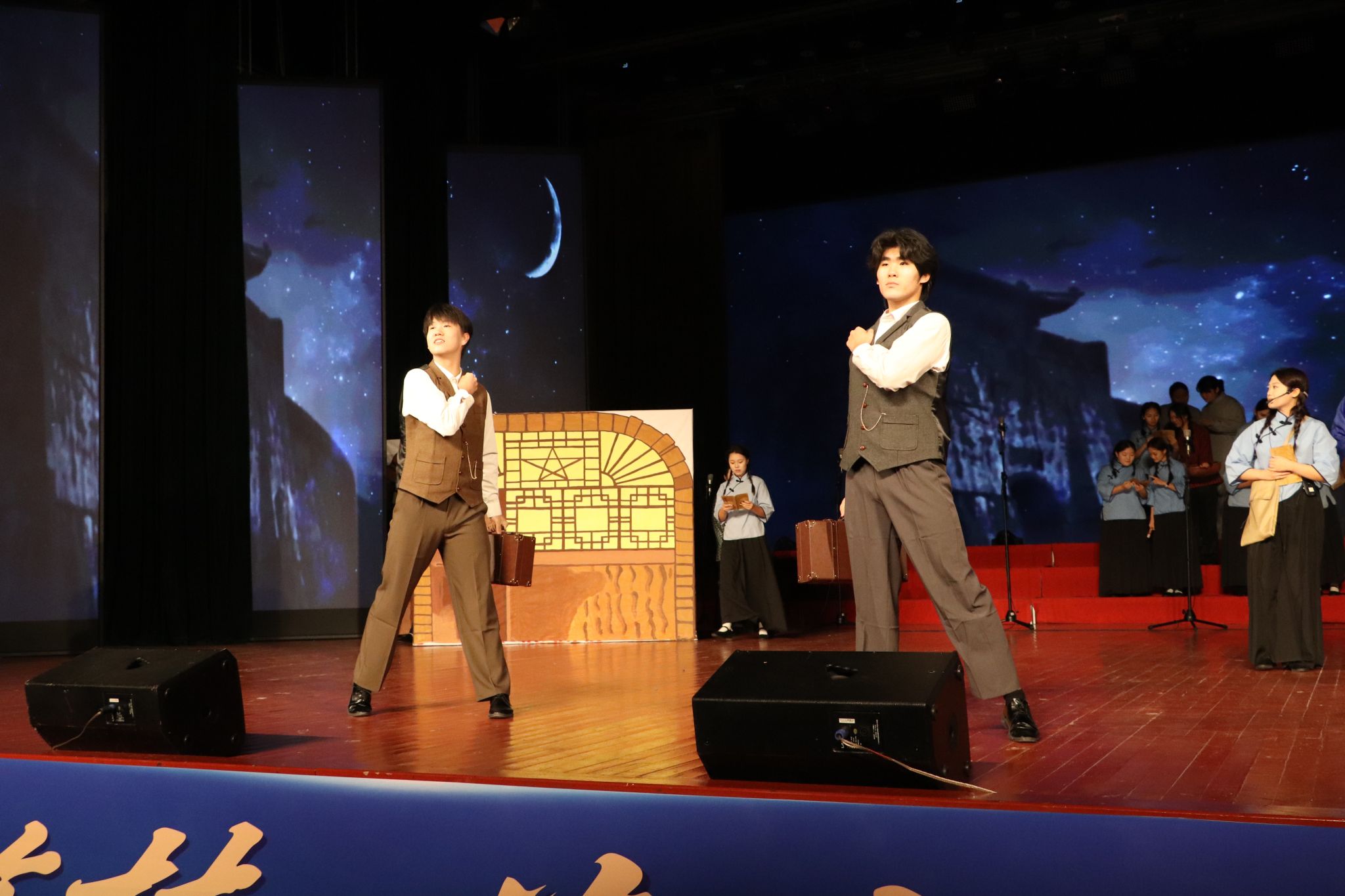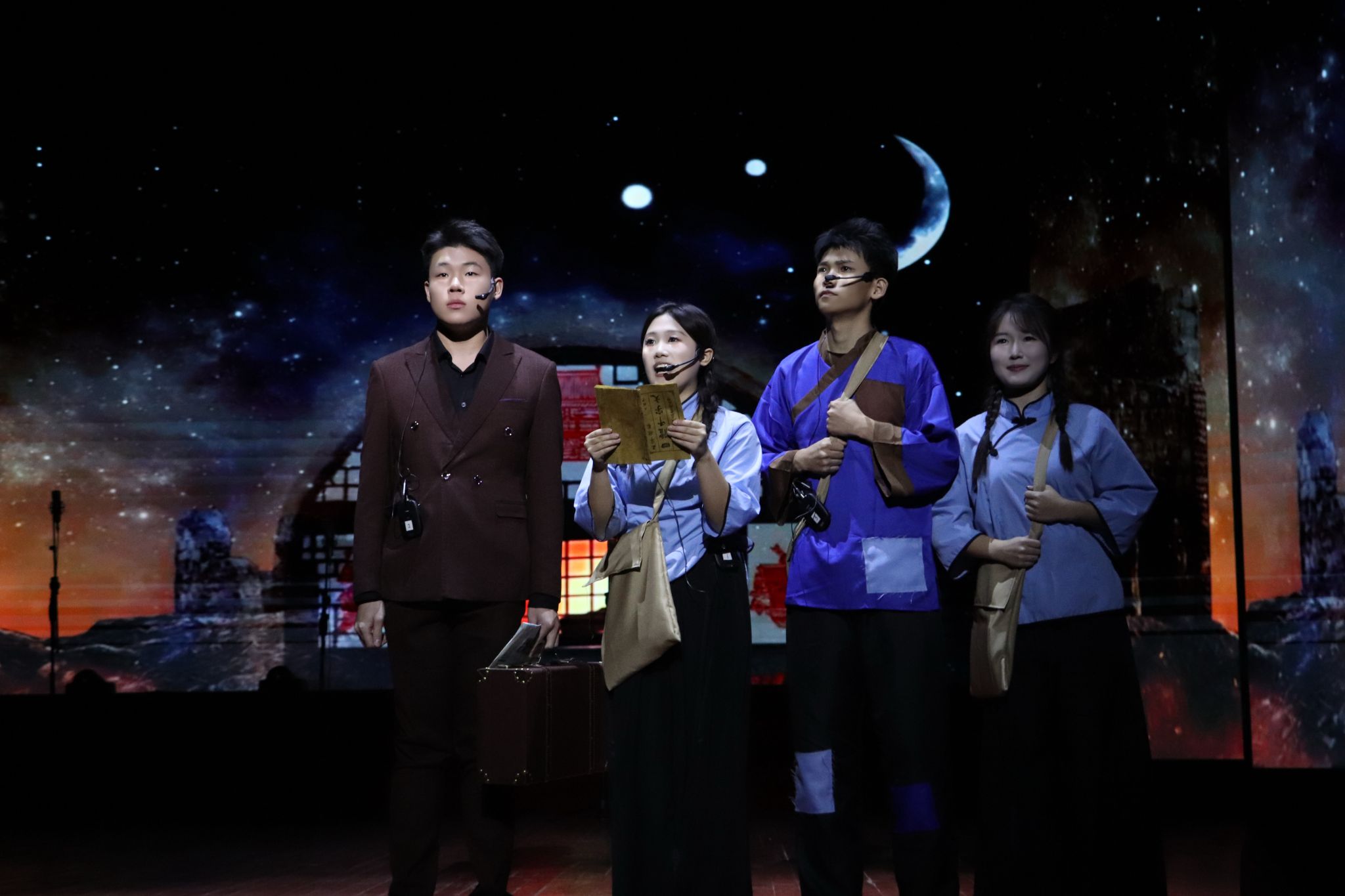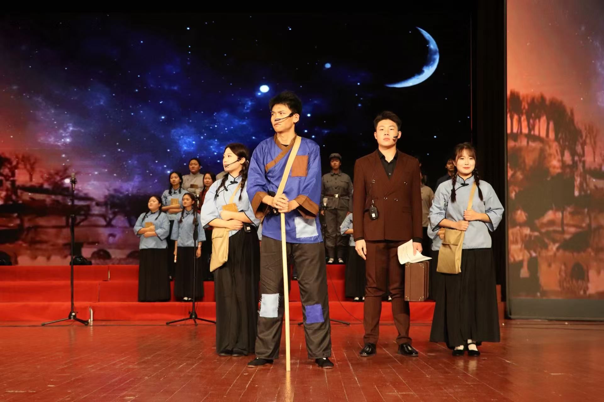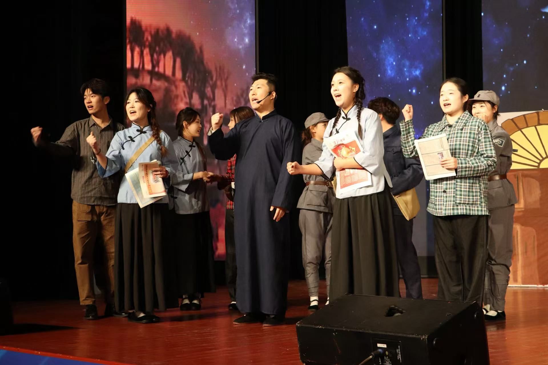 舞台上,我院学子身着多元服饰,精神昂扬、目光如炬,以作品《这束光》展开一场跨越时空的信仰对话。背景光影流转,音乐悠扬起伏,朗诵声韵时而如星火温润坚定,时而似烈焰澎湃激昂,将历史长河中的信仰之光、时代浪潮里的理想之光与青春征程上的希望之光层层点亮、交融升华。作品创新运用跨时空叙事,通过多场景切换与角色化演绎,串联起延安窑洞的如豆灯火、战地硝烟中的信念微光、新时代高铁航母上的璀璨华光,让不同年代的“追光者”穿越时空汇聚一堂,在历史与现实的交响中,绘就一幅从艰难岁月走向盛世辉煌的磅礴画卷。