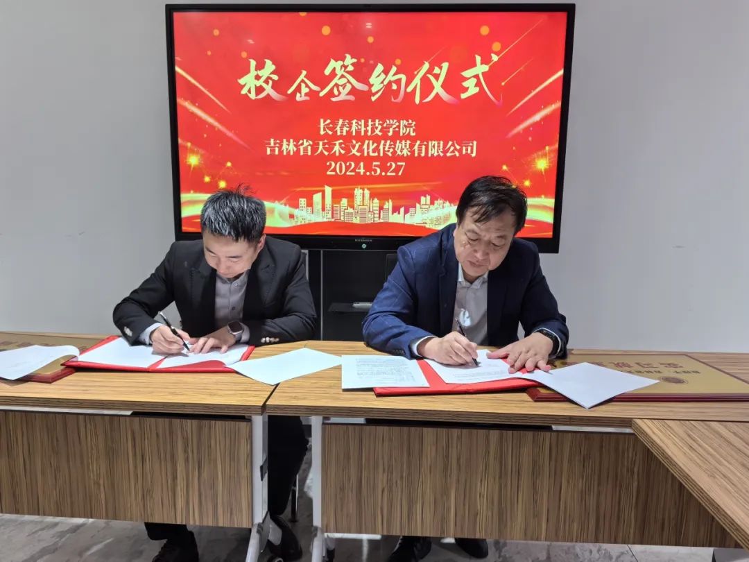 为深化产教融合、校企合作,为毕业生留吉就业搭建平台,促进我校学生持续高质量就业,2024年5月27日,长春科技学院副校长张代治、教务处处长唐敬仙、语言文化学院·新媒体学院陈院长、网络与新媒体专业主任张卫亮、2023级辅导员张凯旋一行赴吉林省国家广告创业园访企拓岗,并与园区内吉林省天禾文化传媒有限公司签订校企合作协议.