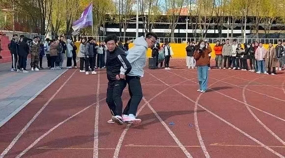 此次比赛以学院为单位,男女不限,两人一组,赛道长度为50米。两个人背靠背夹住一只气球从起点出发,到达终点后把气球放到椅子上坐爆,再以同样的姿势返回起点,此时下一组出发。如果在跑动过程中气球落地或者挤爆,两人要从起点重新出发,率先完成的队伍获胜。