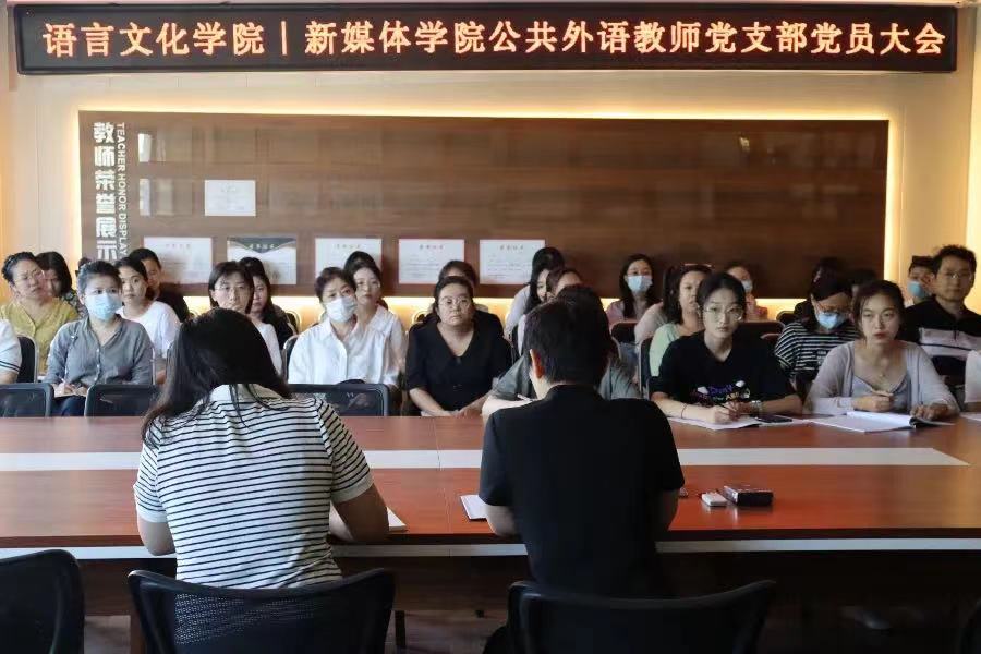 2023年9月8日14:50,语言文化/新媒体学院公共外语教师党支部于第一教学楼217会议室召开党员大会,此次会议由语言文化/新媒体学院党总支书记主持,党总支组织委员张贺亮,及公共外语教师党支部全体教师党员参加。