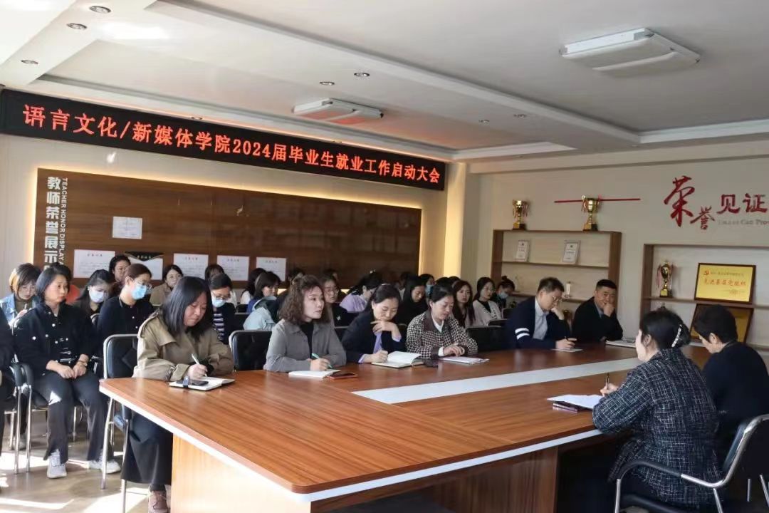 2023年10月12日12:00,语言文化学院·新媒体学院于第一教学楼217会议室召开2024届毕业生就业工作启动大会。此次会议由语言文化学院·新媒体学院副院长王巍主持,语言文化学院·新媒体学院院长,学工办主任、分团委书记张贺亮,各专业主任,各年级辅导员老师以及全体教师出席。