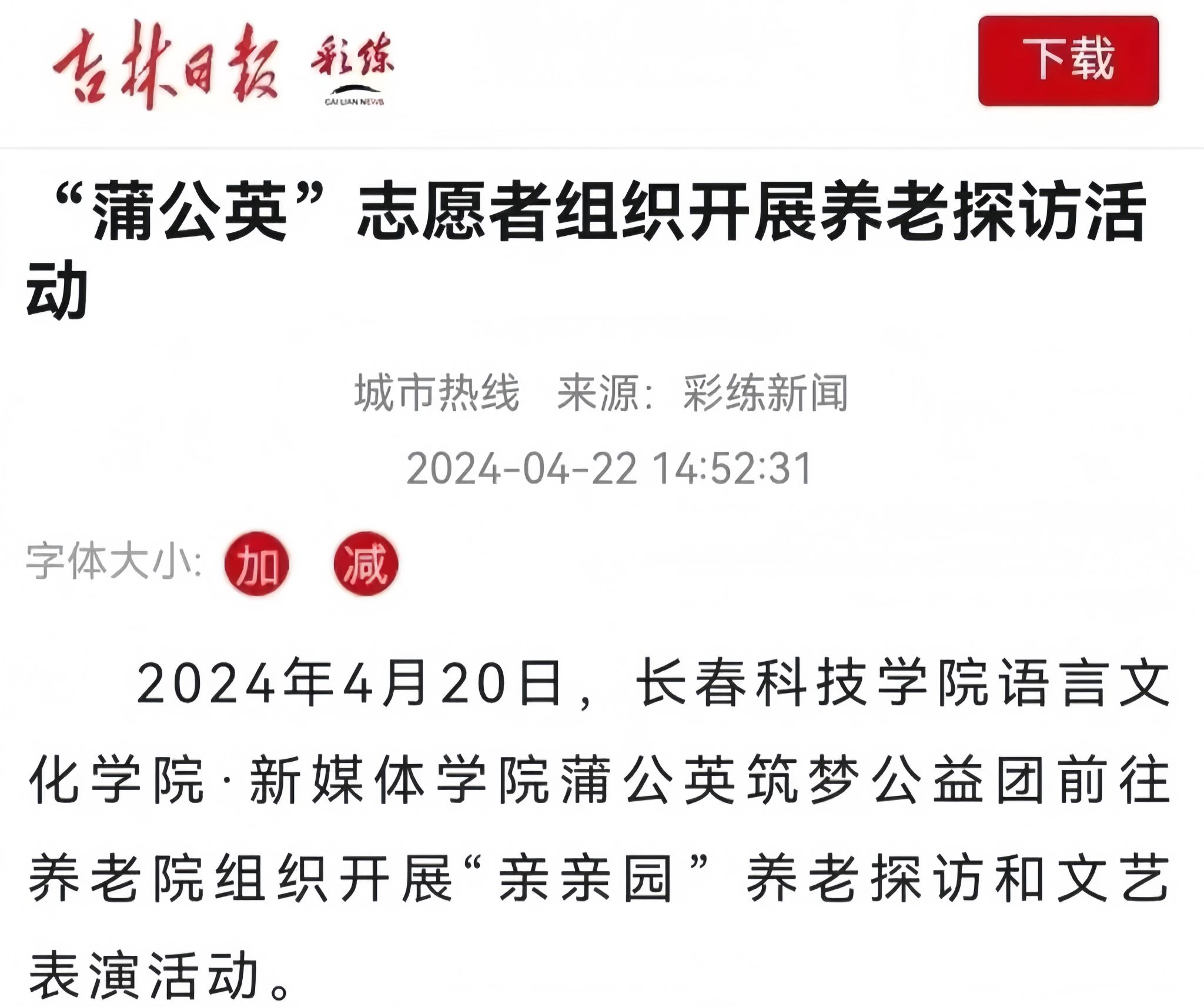 为弘扬中华民族爱老助老的传统风尚,让老人感受社会大家庭的温暖,蒲公英筑梦公益团精心策划了养老院暖心探访活动。活动中,志愿者们带着真诚与爱心,耐心地倾听老人讲述过往的岁月故事,陪老人闲话家常;细心地为老人修剪指甲、整理衣物,用点滴举动传递温情,这份温情的互动也被吉林日报报道和赞扬,传递出了爱老助老的传统风尚。