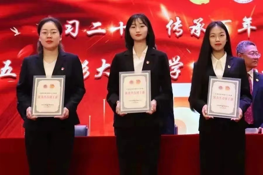 其中,语言文化学院学工办主任、分团委书记张贺亮荣获“长春市优秀团干部”、2022年吉林省大学生创业计划竞赛“优秀指导教师”荣誉称号,2022级辅导员曹莹、韩墨荣获“优秀共青团干部”荣誉称号,2020级汉语国际教育2班、2020级英语1班、2021级汉语国际教育2班荣获“先进团支部”荣誉称号,2020级俄语1班、2021级英语3班荣获“五四红旗团支部”荣誉称号,2021级汉语国际教育3班荣获“先进班级”荣誉称号。语言文化学院蒲公英爱心公益团获得省级一等奖,蒲公英筑梦公益团荣获“优秀社团”荣誉称号。2020级汉语国际教育2班杨子枫受聘为语言文化学院执行主席,2020级英语3班徐子涵受聘为语言文化学院分团委副书记。荣获 “优秀团干部”、“三好学生”、“优秀学生干部”、“优秀志愿者”、 “文体积极分子”、“优秀团员”、“社会实践岗优秀个人”荣誉称号的学生代表分别上台领奖。